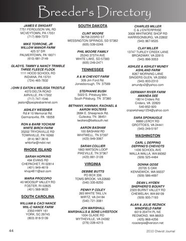 WASHINGTON CARL L DEPPING DEPPING'S CHEVIOTS 1436 SCHOOL AVE WALLA WALLA, WA 99362 (509) 525-4484 DONNA GOSE 20705 S OAK KENNEWICK, WA 99337 (509) 586-4697 DEAN L HYDEN SHEPHERD'S BOUNTY 2320 BURNT VALLEY RD CHEWELAH, WA 99109 (509) 935-7193 ALAN & JULIE REZNICK WINDFIELD FARM 6019 204TH PL NE REDMOND, WA 98053 (425) 868-4256 roosterpie@verizon.net 2010 Cheviot Journal