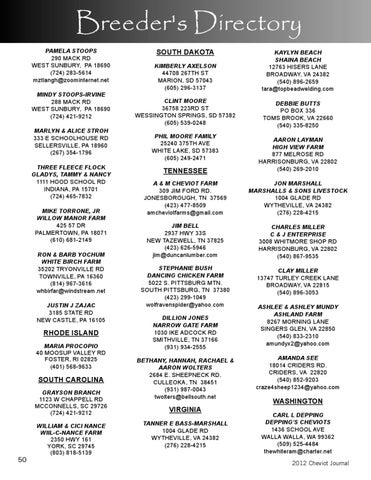 Breeder's Directory PAMELA STOOPS 290 MACK RD WEST SUNBURY, PA 18690 (724) 283-5614 mztlangh@zoominternet.net MINDY STOOPS-IRVINE 288 MACK RD WEST SUNBURY, PA 18690 (724) 421-9212 MARLYN & ALICE STROH 333 E SCHOOLHOUSE RD SELLERSVILLE, PA 18960 (267) 354-1796 THREE FLEECE FLOCK GLADYS, TAMMY & NANCY 1111 HOOD SCHOOL RD INDIANA, PA 15701 (724) 465-7832 MIKE TORRONE, JR WILLOW MANOR FARM 425 57 DR PALMERTOWN, PA 18071 (610) 681-2149 RON & BARB YOCHUM WHITE BIRCH FARM 35202 TRYONVILLE RD TOWNVILLE, PA 16360 (814) 967-3616 whbirfar@windstream.net JUSTIN J ZAJAC 3185 STATE RD NEW CASTLE, PA 16105