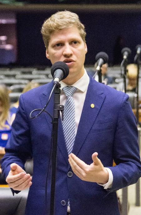 Deputy leader of NOVO's MPs in the Chamber of Deputies, Tiago Mitraud, 33, is a Business Administration bachelor by the Federal University of Paraná, and has ompleted the Leadership Development ogram at Har vard Business School. He was the Executive Director of Fundação Estudar and chaired Brasil Junior razilian Confederation of Junior Enterprises).
