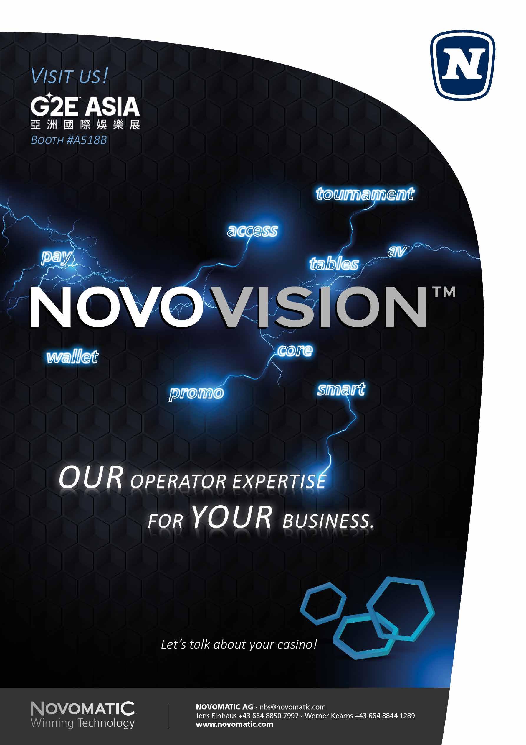 Owner, publisher, service provider: NOVOMATIC AG, Wiener Strasse 158, 2352 Gumpoldskirchen, Austria, Commercial register number: FN 69548 b, Landesgericht Wiener Neustadt, VAT number: ATU 15031007, Corporate purpose: Development, production, distribution and renting of gaming machines. Editorial concept: Information about international markets of the gaming industry, products and services as well as news of the group of companies and its partners, Board of Directors: Ryszard Presch, Johannes Gratzl, Stefan Krenn, Supervisory Board: Dr. Bernd Oswald, Martina Flitsch, Univ.Prof. Robert Hofians, Professional law: Trade regulations: ris.bka.gv.at/GeltendeFassung.wxe?Abfrage= Bundesnormen&Gesetzesnummer=10007517, Trade authority: Bezirkshauptmannschaft (District Commission) Mödling, Member of the WKÖ, WKNÖ, Contacts: Manuela Kammerer, Group Marketing & PR, mkammerer@novomatic.com, Phone: +43 2252 606 870 778, Editorial team: Manuela Kammerer, Tatjana Brajdic, Paola Kosch, Hannes Reichmann, Alexandra Lindlbauer, Art and layout: Georg Möhrke, Images: NOVOMATIC, Thomas Meyer Photography, NLK Burchart, Printed by: NOVOMATIC AG, Wiener Strasse 158, A-2352 Gumpoldskirchen, Austria, ISSN 1993-4289 (print), ISSN 1994-2478 (online)