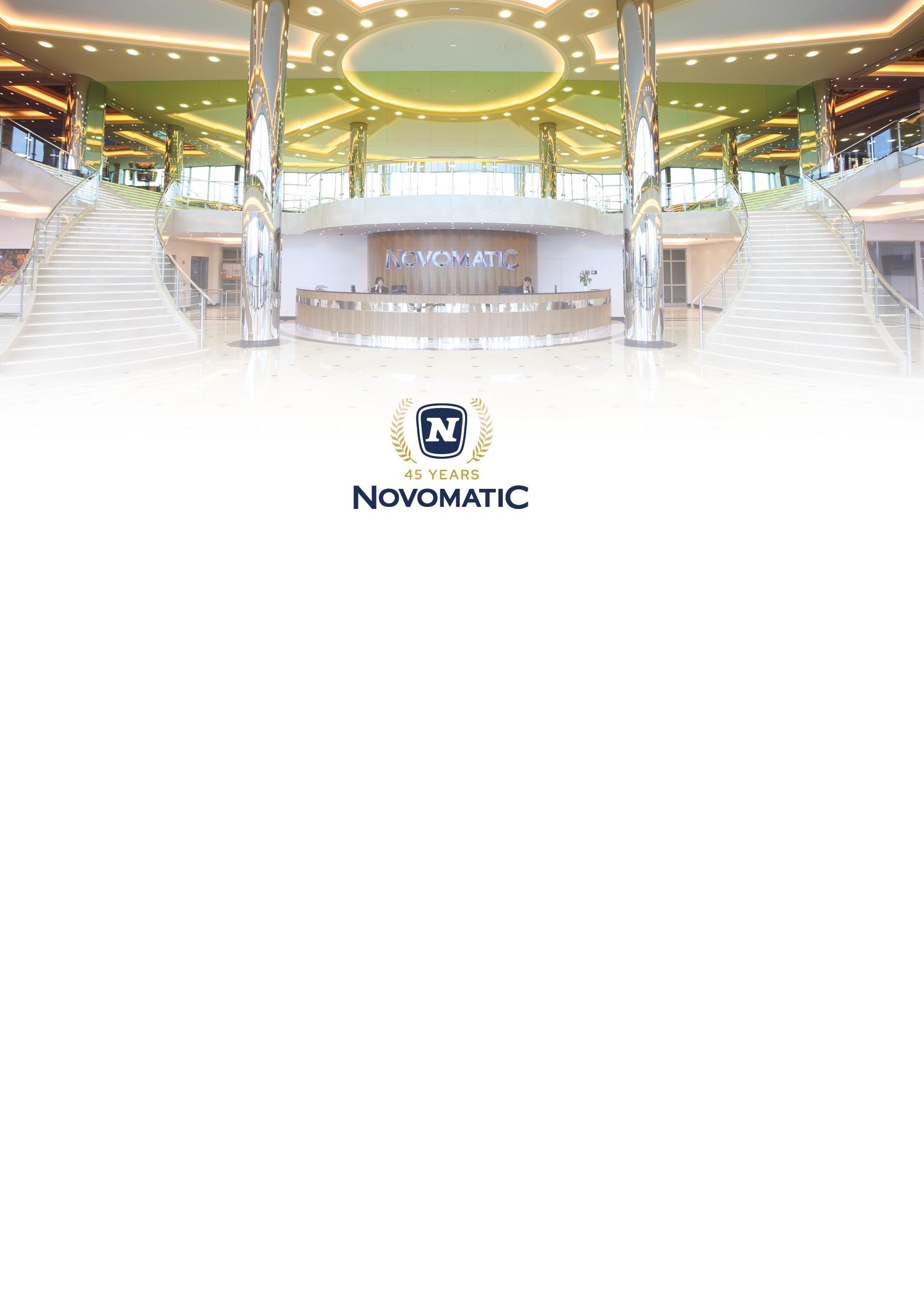 Owner, publisher, service provider: NOVOMATIC AG, Wiener Strasse 158, 2352 Gumpoldskirchen, Austria, Commercial register number: FN 69548 b, Landesgericht Wiener Neustadt, VAT number: ATU 15031007, Corporate purpose: Development, production, distribution and renting of gaming machines. Editorial concept: Information about international markets of the gaming industry, products and services as well as news of the group of companies and its partners, Board of Directors: Ryszard Presch, Johannes Gratzl, Stefan Krenn, Supervisory Board: Dr. Bernd Oswald, Martina Flitsch, Univ.Prof. Robert Hofians, Professional law: Trade regulations: ris.bka.gv.at/GeltendeFassung.wxe?Abfrage= Bundesnormen&Gesetzesnummer=10007517, Trade authority: Bezirkshauptmannschaft (District Commission) Mödling, Member of the WKÖ, WKNÖ, Contacts: Manuela Kammerer, Group Marketing & PR, mkammerer@novomatic.com, Phone: +43 2252 606 870 778, Editorial team: Manuela Kammerer, Tatjana Brajdic, Hannes Reichmann, Alexandra Lindlbauer, Art and layout: Georg Möhrke, Images: NOVOMATIC, Thomas Meyer, Ana Studios, Printed by: NOVOMATIC AG, Wiener Strasse 158, A-2352 Gumpoldskirchen, Austria, ISSN 1993-4289 (print), ISSN 1994-2478 (online)