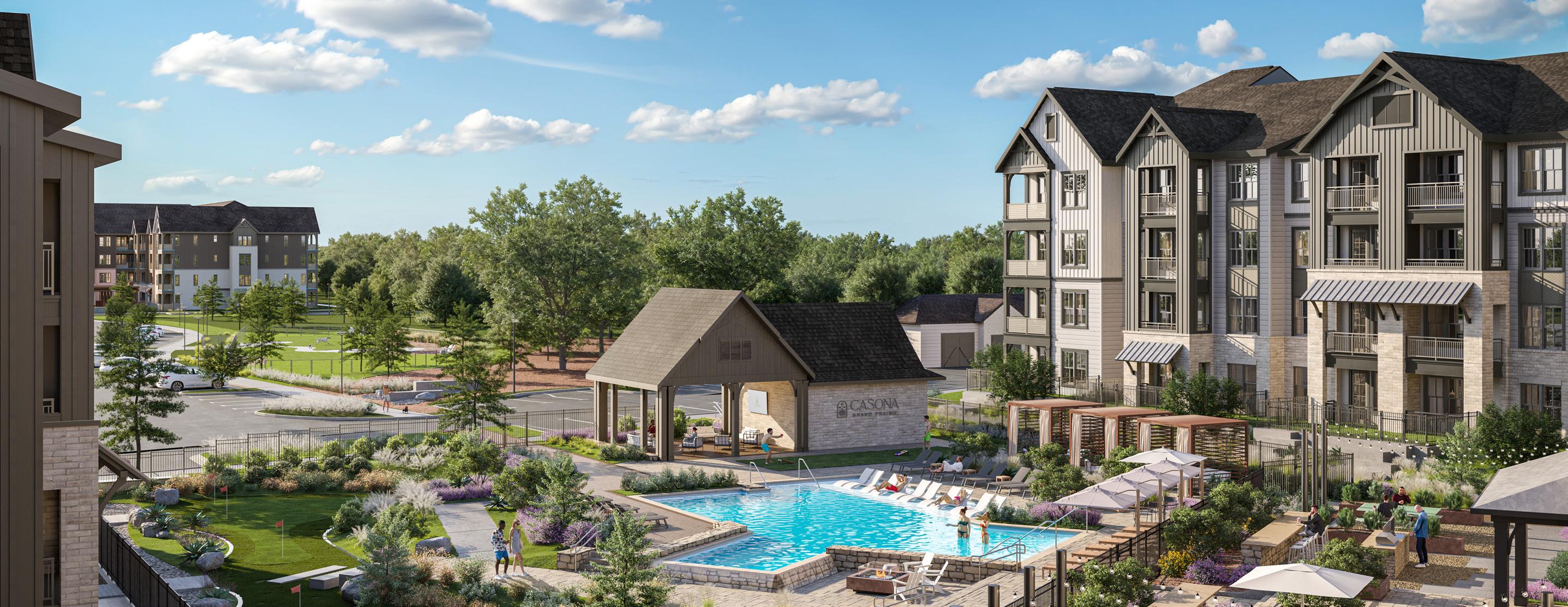 Casona will offer 155 one-bedroom, 119 two-bedroom, and 31 three-bedroom units spread across seven fourstory, surface-park buildings to maintain an efficient cost of construction while offering a Class A amenity package coupled with high-end fixtures & finishes. The Project will feature over 11,000 sf of interior amenity space accompanied by a resort-style pool with outdoor grilling stations, fireplaces, and pickleball facilities.