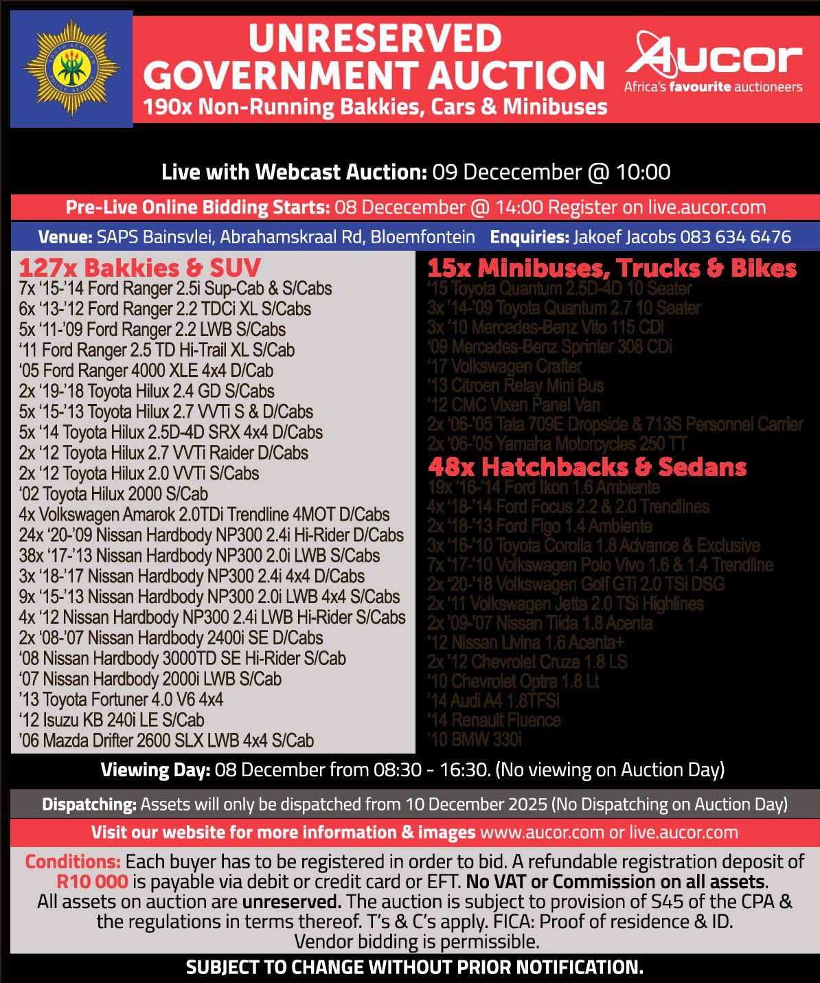Any person may, within 21 days from 5 D E C E M B E R 2 0 2 5 , VECTOSTYLE intends to lodge in terms of section 33 of the Free State Gambling and liquor Act, 2010 an objection in writing to the Free State Liquor Authority (address hereunder). The objection must clearly indicate the Full Names, identity number, residential address, postal address and telephone number, if any, and where applicable, its registration number and address of its office, of the objector. The Objection must also identify the application to