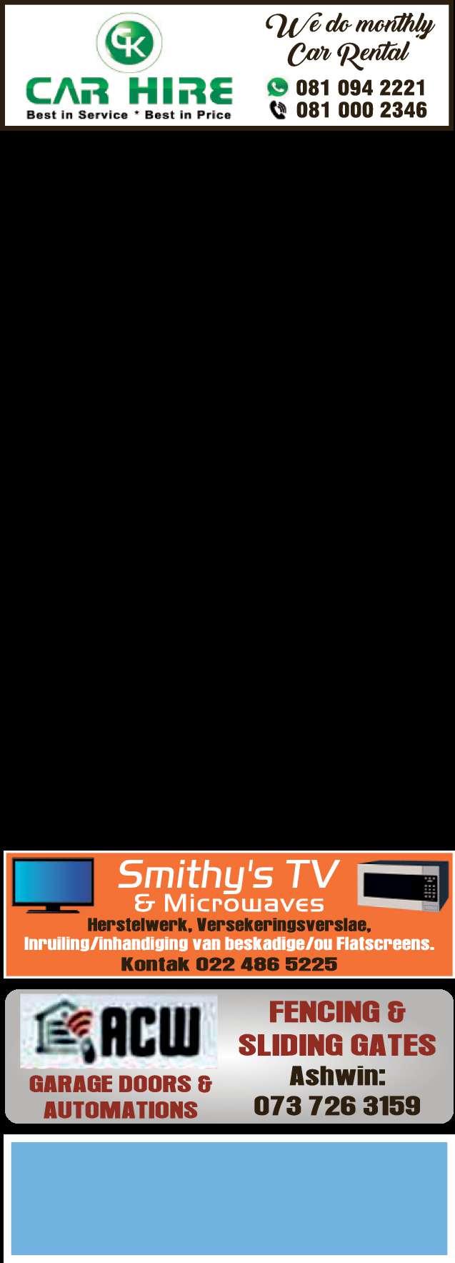 Die aansoek om hersonering van erf 4052, Darling, ingevolge ar kel 25(2)(a) van Swartland Munisipaliteit : Verordening insake Munisipale Grondgebruikbeplanning (PK 8226 van 25 Maart 2020), is ontvang. Die voorstel is dat erf 4052 (groot 9210m²) hersoneer word vanaf Oopruimtesone 2 na Gemeenskapsone3teneindedieperseelaantewendvirinrig ngsdoeleindes(gemeenskapfasiliteite). Kennis word hiermee gegee ingevolge ar kel 55(1) van Swartland Munisipaliteit : Verordening insake MunisipaleGrondgebruikbeplanningdatbogenoemdeaansoekontvangisenbeskikbaarisvirinspeksie vanaf Maandag tot Donderdag tussen 08:00-13:00 en 13:45 - 17:00 en Vrydag 08:00-13:00 en 13:4515:45 by Departement Ontwikkelingsbestuur, kantoor van die Senior Bestuurder : Ontwikkelingsbestuur, Munisipale Kantoor, Kerkstraat, Malmesbury Enige skri�elike kommentaar hetsy ‘n beswaar of ondersteuning kan ingevolge ar kel 60 van genoemde wetgewing aan Die Munisipale Bestuurder, Privaatsak X52, Malmesbury, 7299/Faks – 022-487 9440/e-pos –swartlandmun@swartland.org.za gestuur word voor of op 23 Januarie 2026 om 17:00. Die kommentaarmoetassebliefunaam,adresenkontakbesonderhedeasookdievoorkeurwysewaarop daar met u gekommunikeer moet word aandui, sowel as u belang by die aansoek asook redes vir u kommentaar Telefoniese navrae kan gerig word aan die stadsbeplanningsafdeling (Alwyn Burger Herman Olivier en Annelie de Jager) by 022-487 9400. Die Munisipaliteit mag kommentaar wat na die slui ngsdatum ontvang word weier Persone wat nie kan skryf nie sal deur ‘n munisipale amptenaar bygestaanwordomhullekommentaaropskriftestel