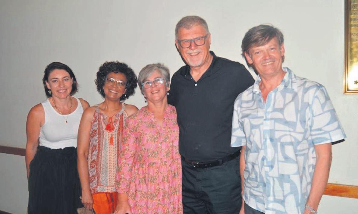 Die misdaadskrywer Deon Meyer was by sy laaste boekbekendstelling vir 2025 die gas van Malmesbury se Boekklub. Van links is Lydia Kastel (Funky Ouma en borg), Leonita Coutts (’n skrywer van Malmesbury), Talita Viola (die biblioteekhoof), Meyer en Eben Pienaar, die reklamebestuurder by Jonathan Ball Uitgewers Foto: Sarie Nell