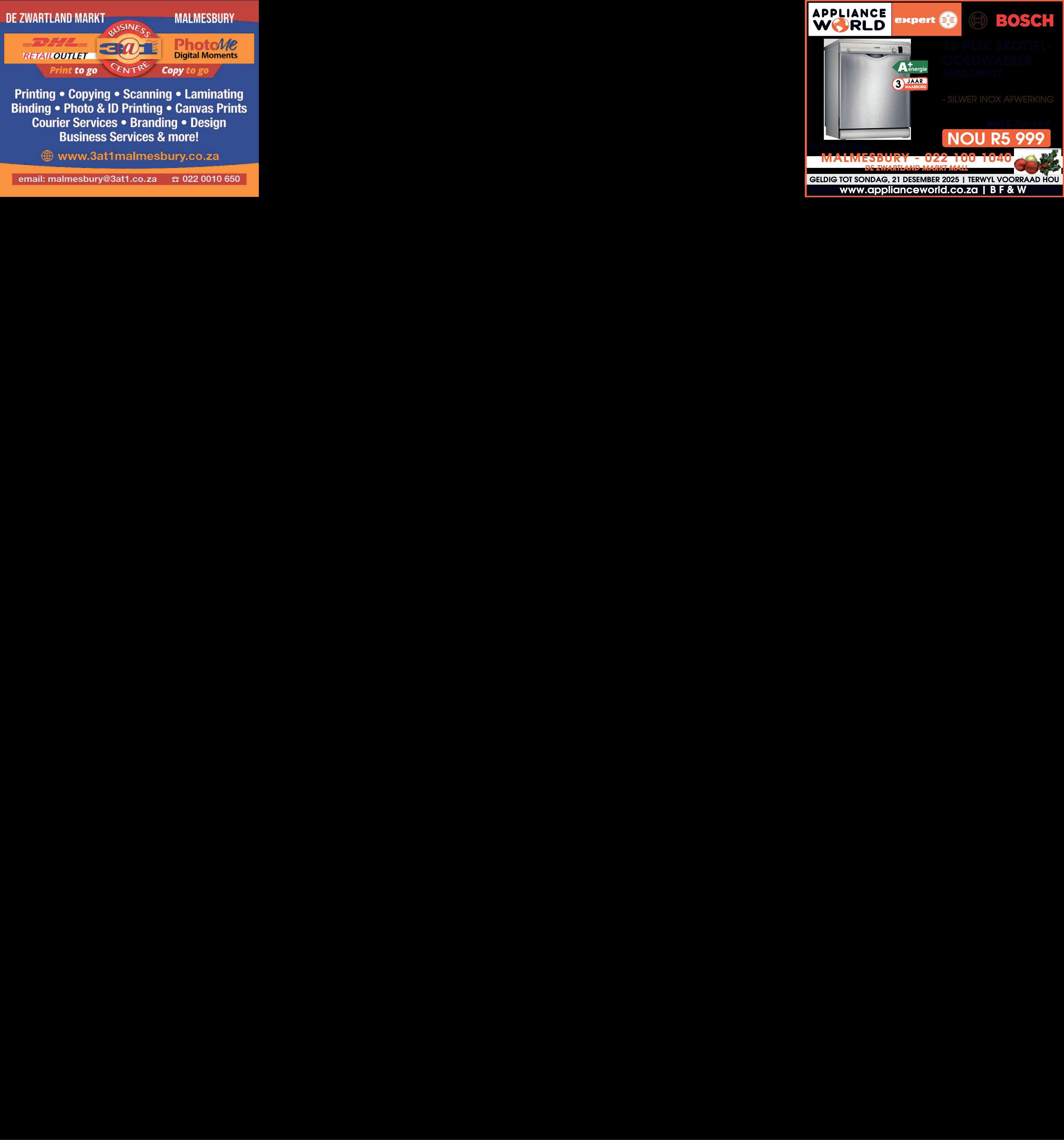 Notice is hereby given in terms of section 55(1) of the By-law on Municipal Land Use Planning that the abovementioned application has been received and is available for inspection from Monday to Thursday between 08:00-13:00 and 13:45 - 17:00 and Friday 08:00-13:00 and 13:45 - 15:45 at the Department Development Management, office of the Senior Manager : Development Management, Municipal Office, Church Street, Malmesbury Any written comments whether an objection or support may be addressedintermsofsection60ofthesaidlegislationtoTheMunicipalManager,PrivateBagX52, Malmesbury, 7299/Fax – 022-487 9440/e-mail – swartlandmun@swartland.org.za on or before 23 January 2026 at 15:45, quoting your name, address or contact details as well as the preferred method of communication, interest in the application and reasons for comments. Telephonic enquiriescanbemadetothetownplanningdivision(AlwynBurger,HermanOlivierorAnneliedeJager)at 022-4879400.TheMunicipalitymayrefusetoacceptcommentreceivedaftertheclosingdate.Anyperson whocannotwritewillbeassistedbyamunicipalofficialbytranscribingtheircomments