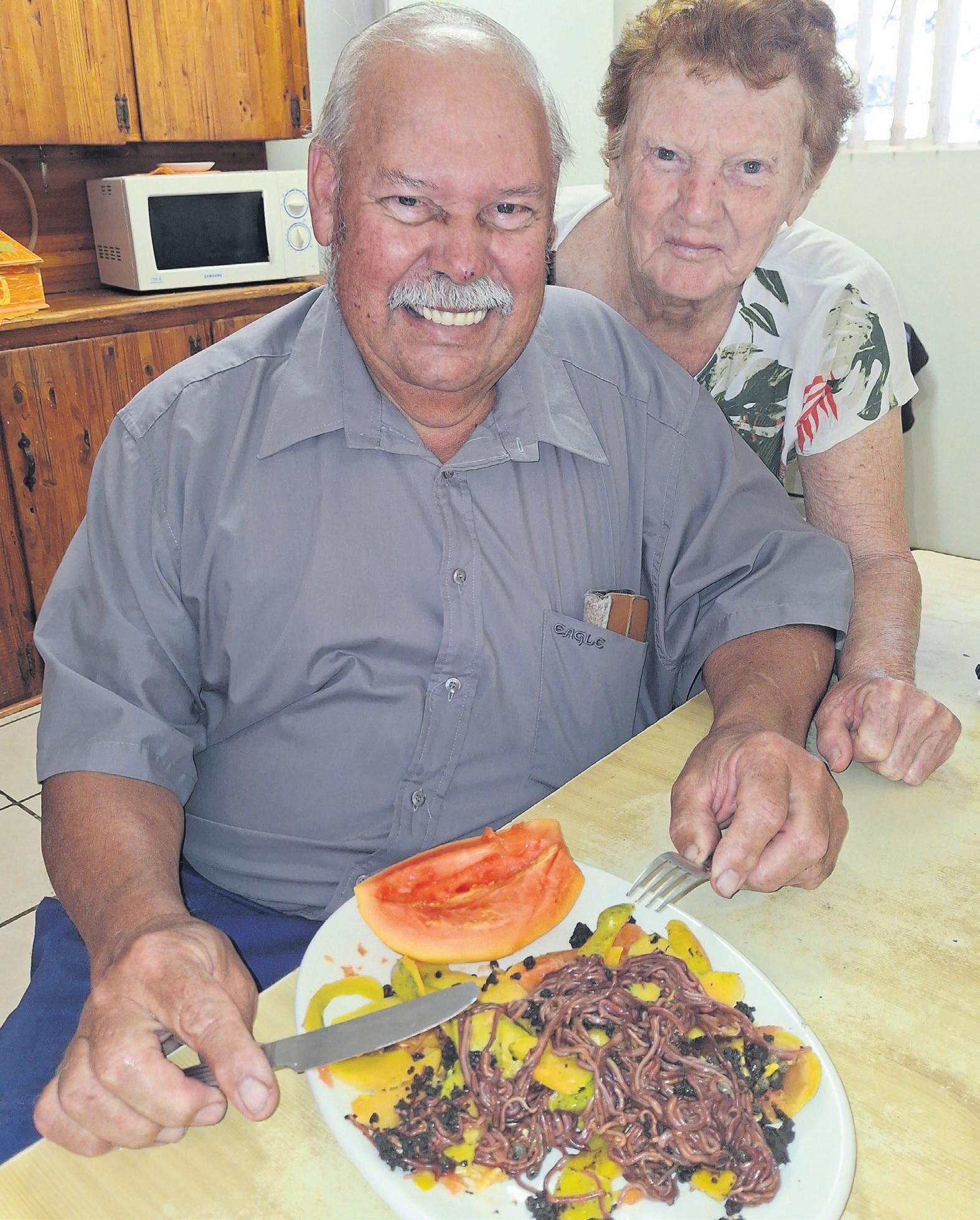 Humansdorp se Wurmman, Jan Bezuidenhout (69) en sy vrou Jane. Hulle wys hier hoe hulle saam met die erdwurms ’n bord met heerlike papaja kan geniet! INLAS: Hoenderboere en vissermanne is van Jan se grootste kliënte. Erdwurms word in polistereenhouers per padvervoer oor die hele land versprei Pampoene van tot 14 kilogram word jaarliks uit die Bezuidenhouts se goedbewurmde grond es Jan het ook die afgelope twee jaar met meelwurms begin boer