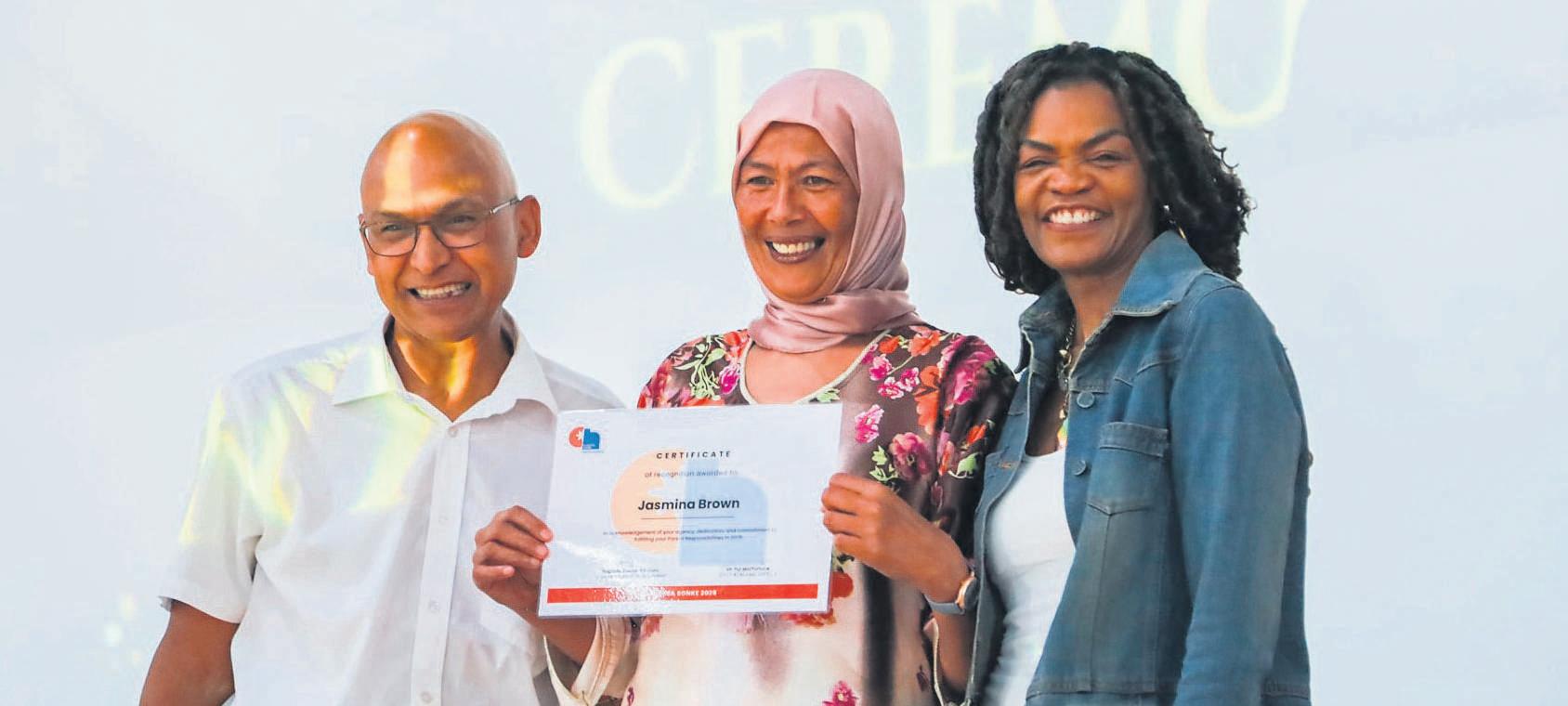 Fellow parent Jasmina Brown poses for a photo with her certificate, middle. On the right is chief academic officer at CHSA, Dr Ronald Fortune, and Eugenia Dlodlo-Sibanda, Dean of Student Development, left