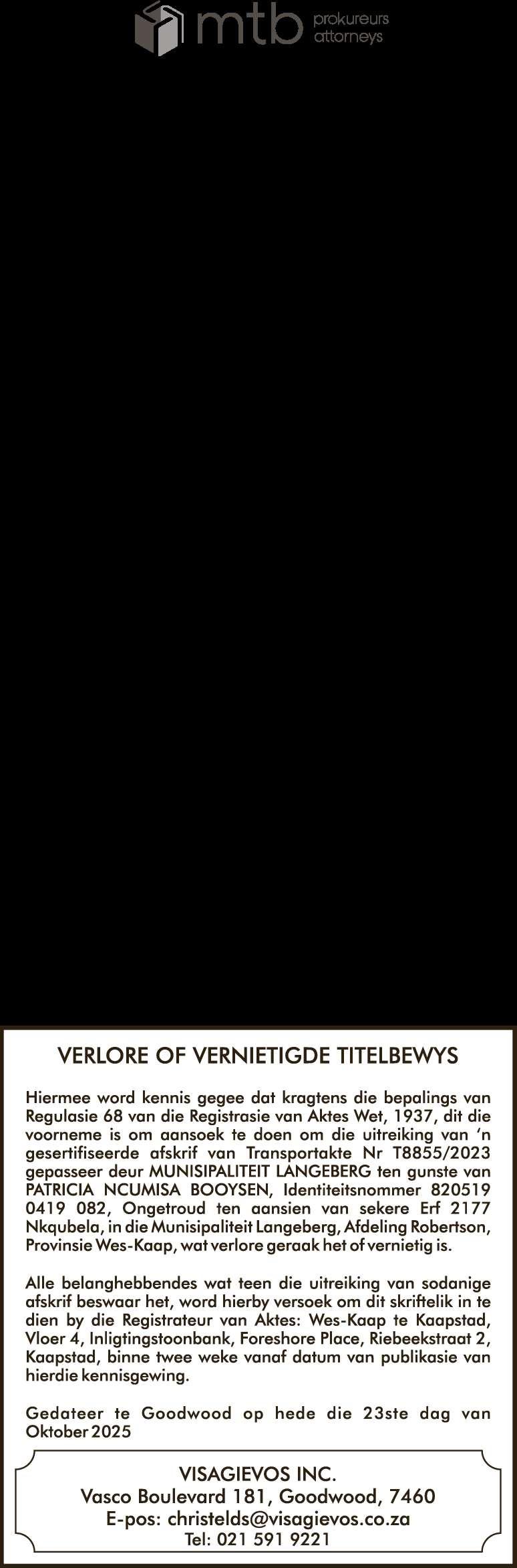 Begrafnisdiens vind plaas Saterdag, 01 November 2025 om 09:30 by