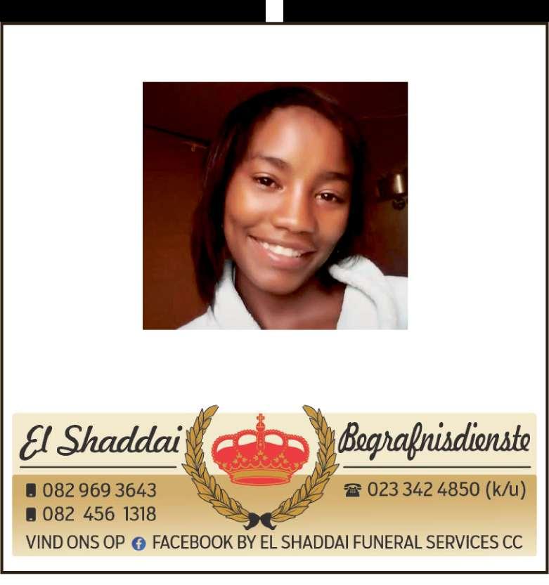 Begrafnisdiens vind plaas Saterdag, 01 November 2025 om 11:00 by Sohngelaan 66, Esselenpark en om 12:00 by VGK Worcester-Oos Kerk, Fischerstraat.