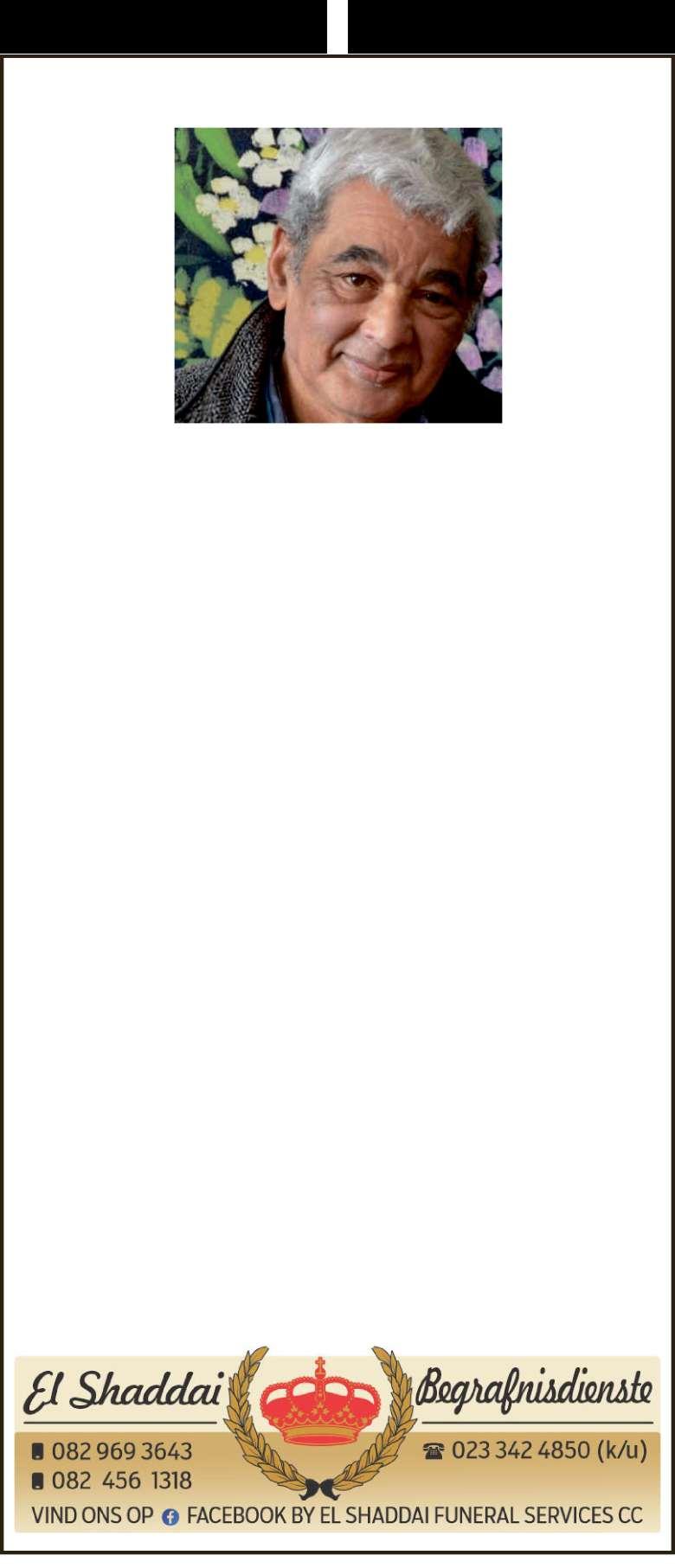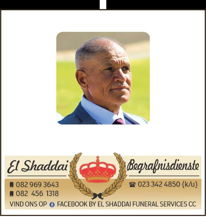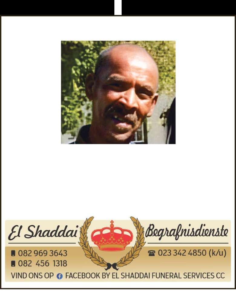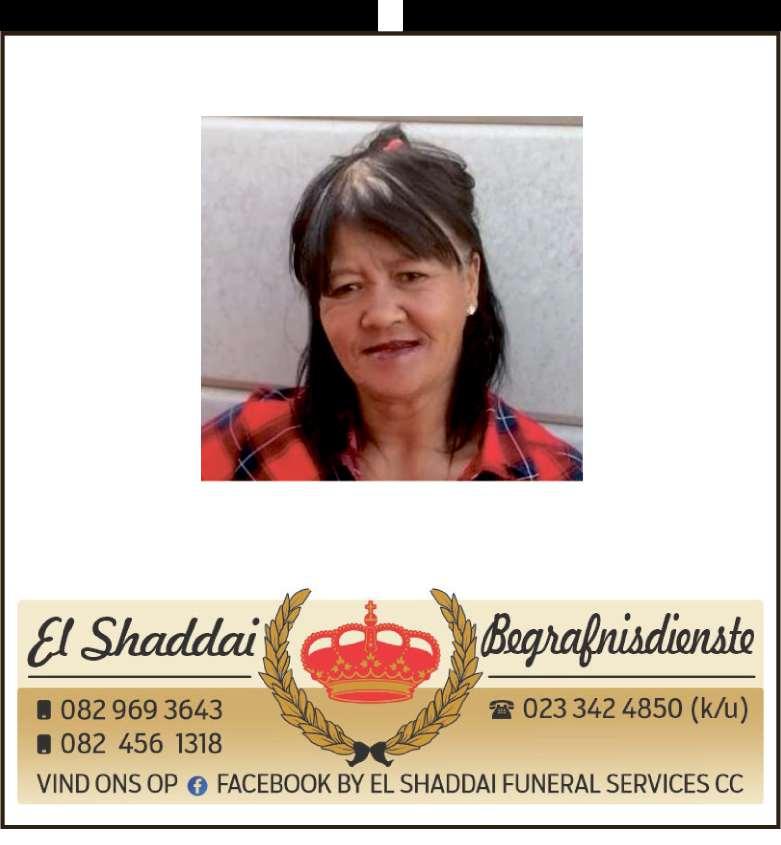 Begrafnisdiens vind plaas Saterdag, 15 November 2025 om 08:00 by Taambaystraat 54, Roodewal en om 09:00 by A.M.E Calvery Kerk, Excelsiorweg, Hexpark
