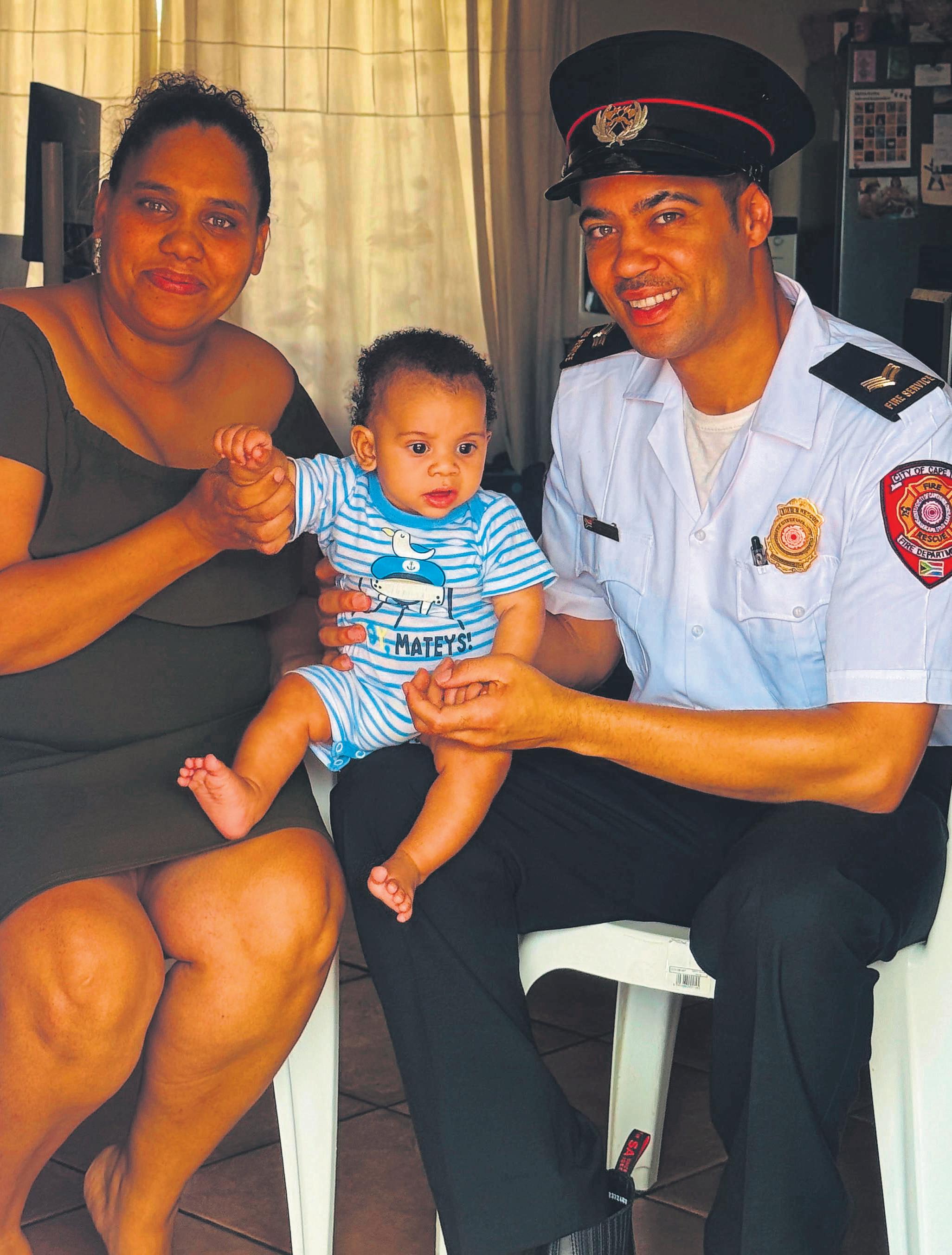 Mariam Pharoe with littel Daniel and fire fighter Arlin Thielman