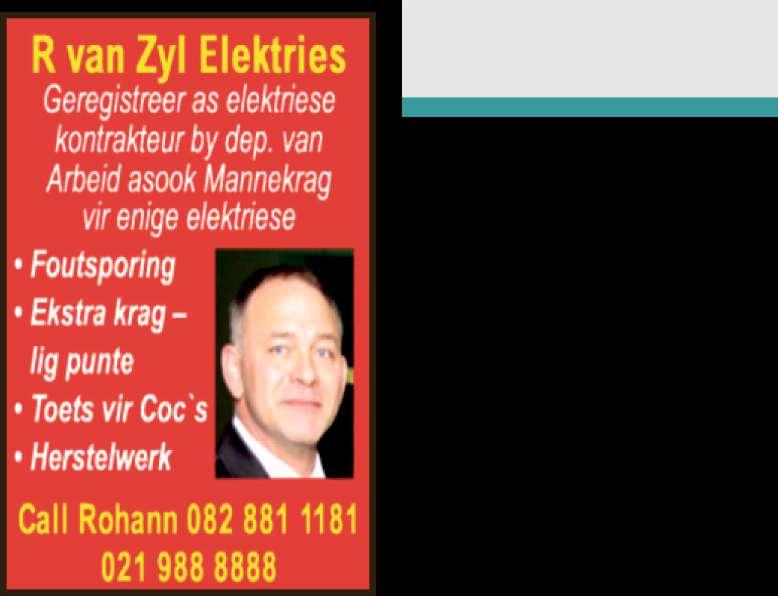 . Die Brackenfell Forum bied aan "Koffie uit jou kan" in die Rusoord-saal in Dennegeurstraat om 10:00 vir lede van die gemeenskap om saam te kuier Kaartjies kos R150 elk. Bespreek by Alta by 083 967 9493 of Letitia by 082 879 5383.