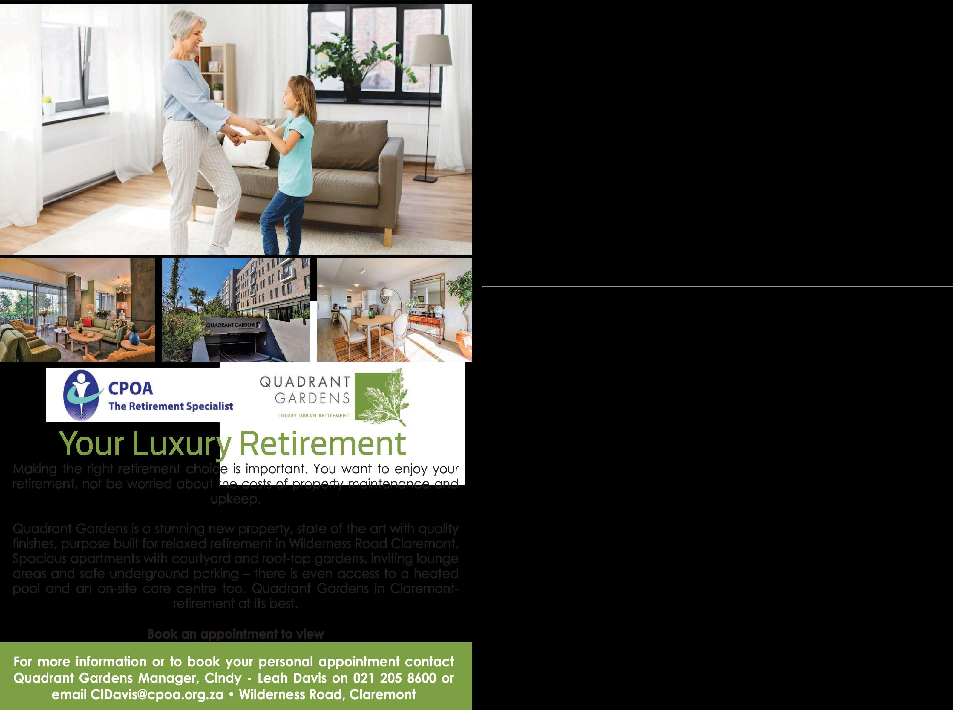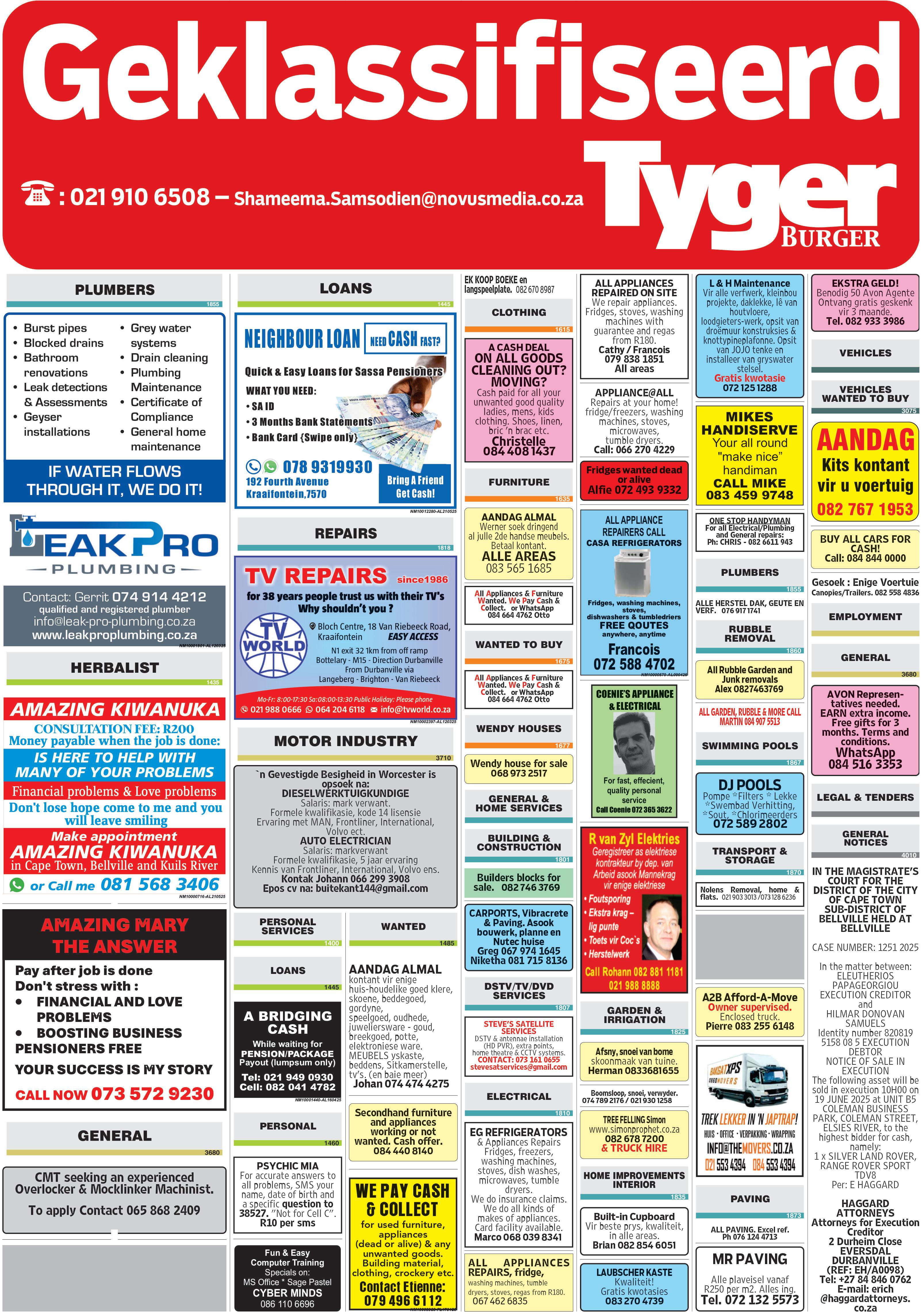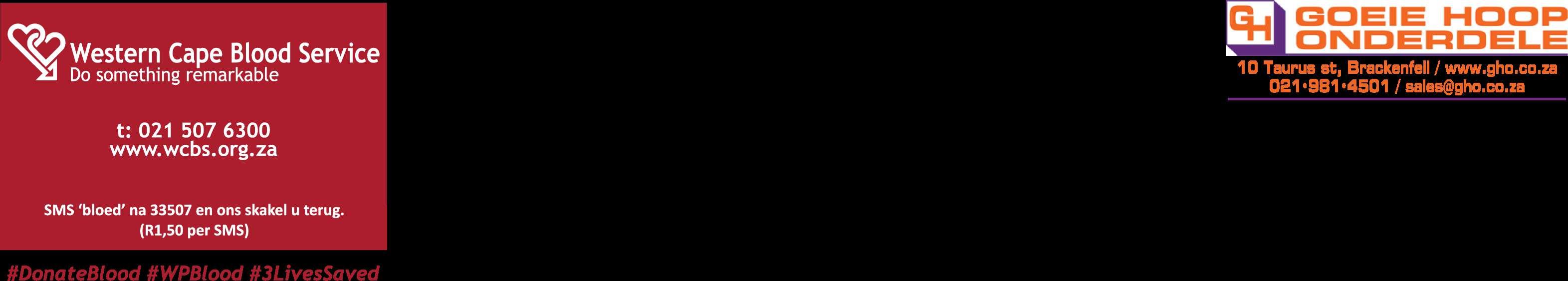 . Trivia-aand ten bate van die Oom Vossie-dakfonds. Maksimum ses mense per span. Kaartjies kos R100 elk. Koeldrank en lekkers sal by die kiosk verkoop word. Skakel 084 325 6496 vir meer inligting. .Join the Goodwood Fashion and Thrift Bargains Market from 09:00 to 13:20 at the Goodwood Sports Club (corner of Milton and Alice street). A garment donation bin will be available in the foyer your pre-loved clothes can make a meaningful difference For more information, email thegoodwoodmarket@ gmail.com or WhatsApp 064 529 8020