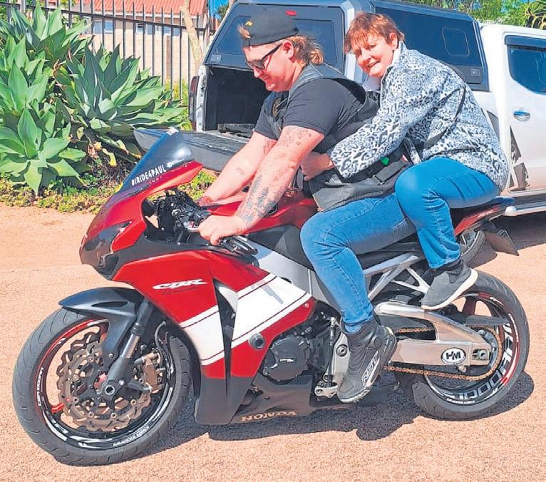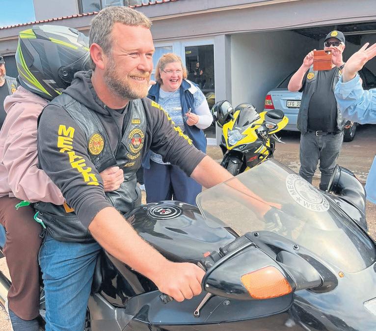 Benj Truter, Megaforce Weskus se klubpresident, geniet die oomblik om Cora Kotze van Huis Wittekruin op sy motorfiets te laat ry.