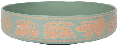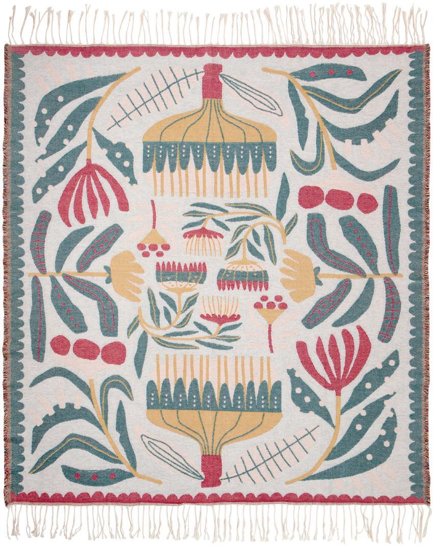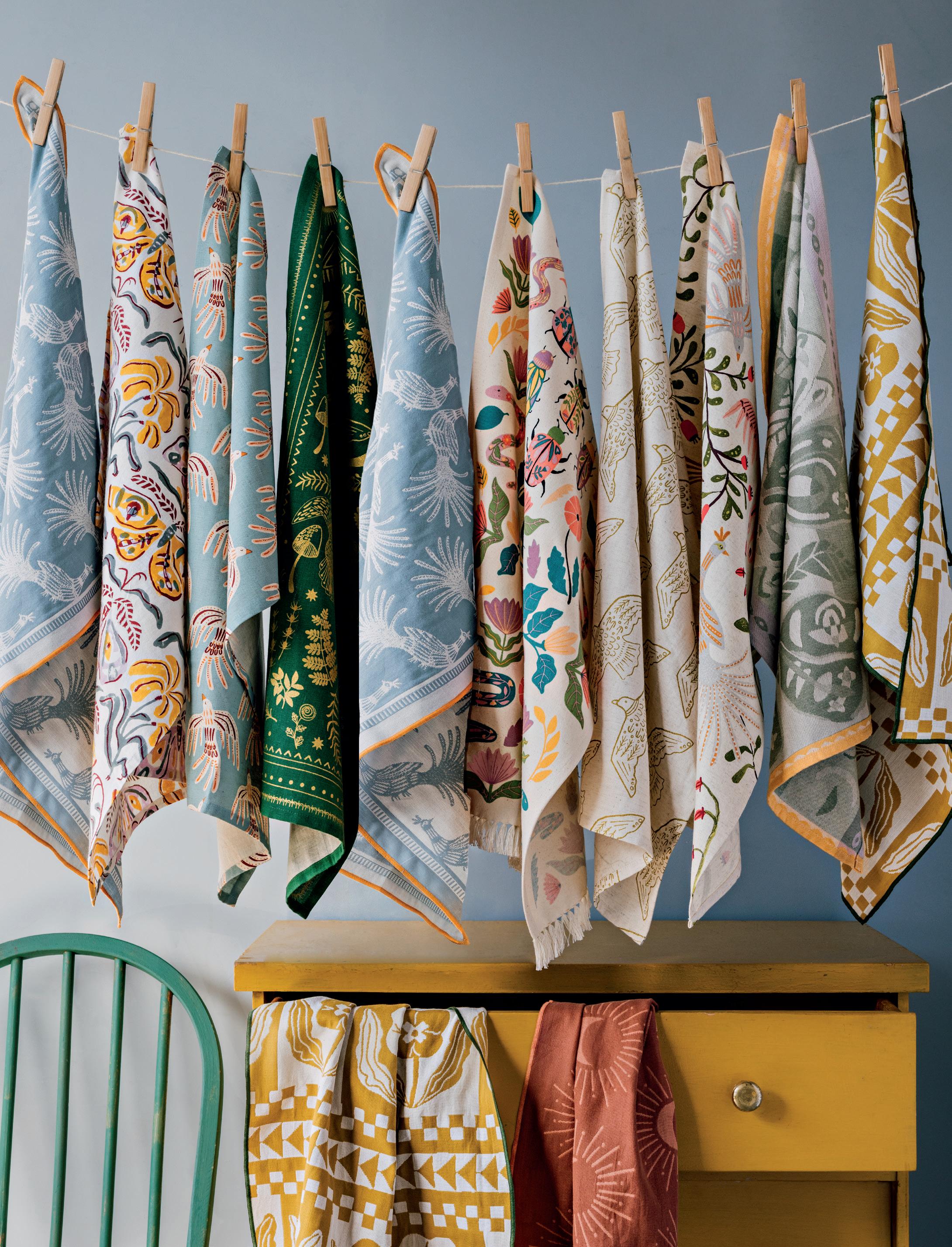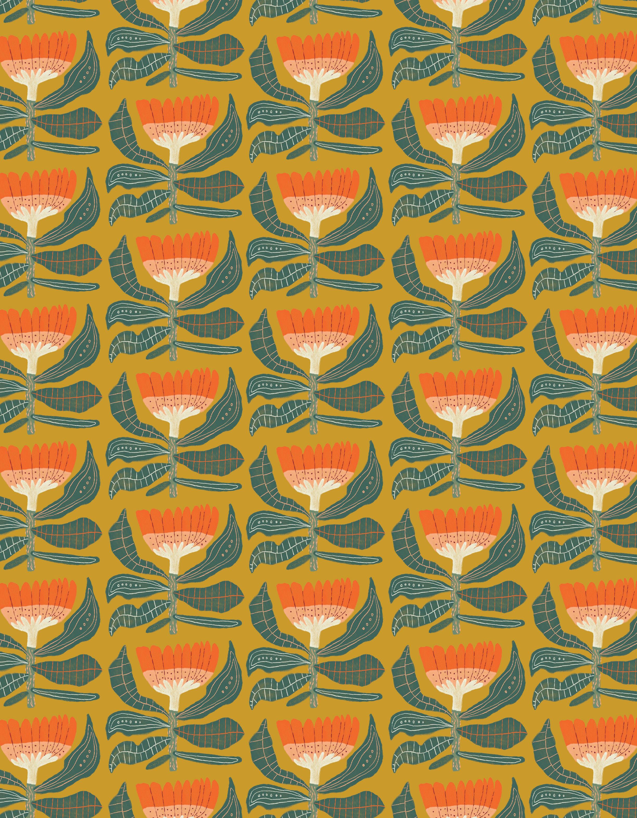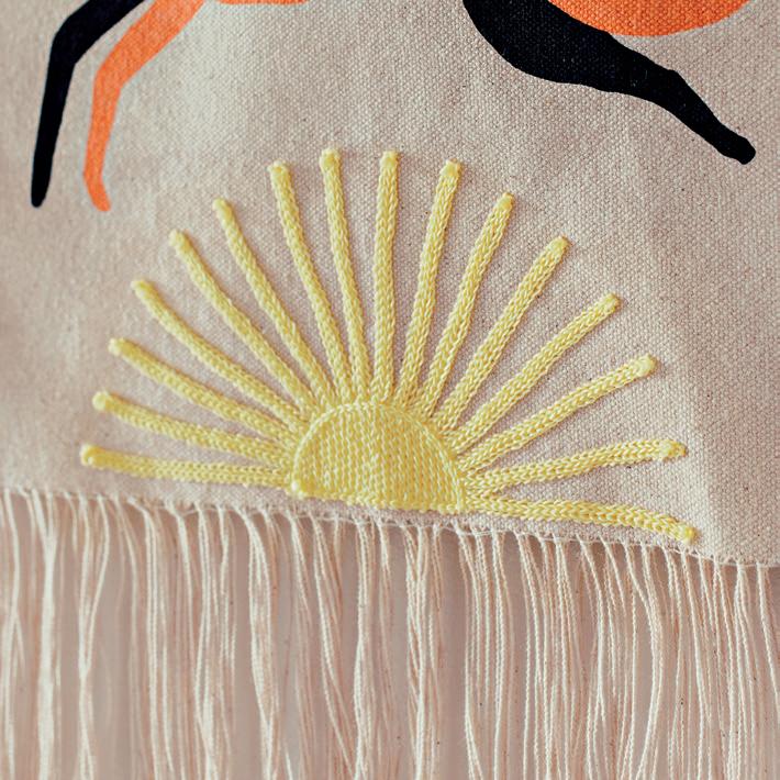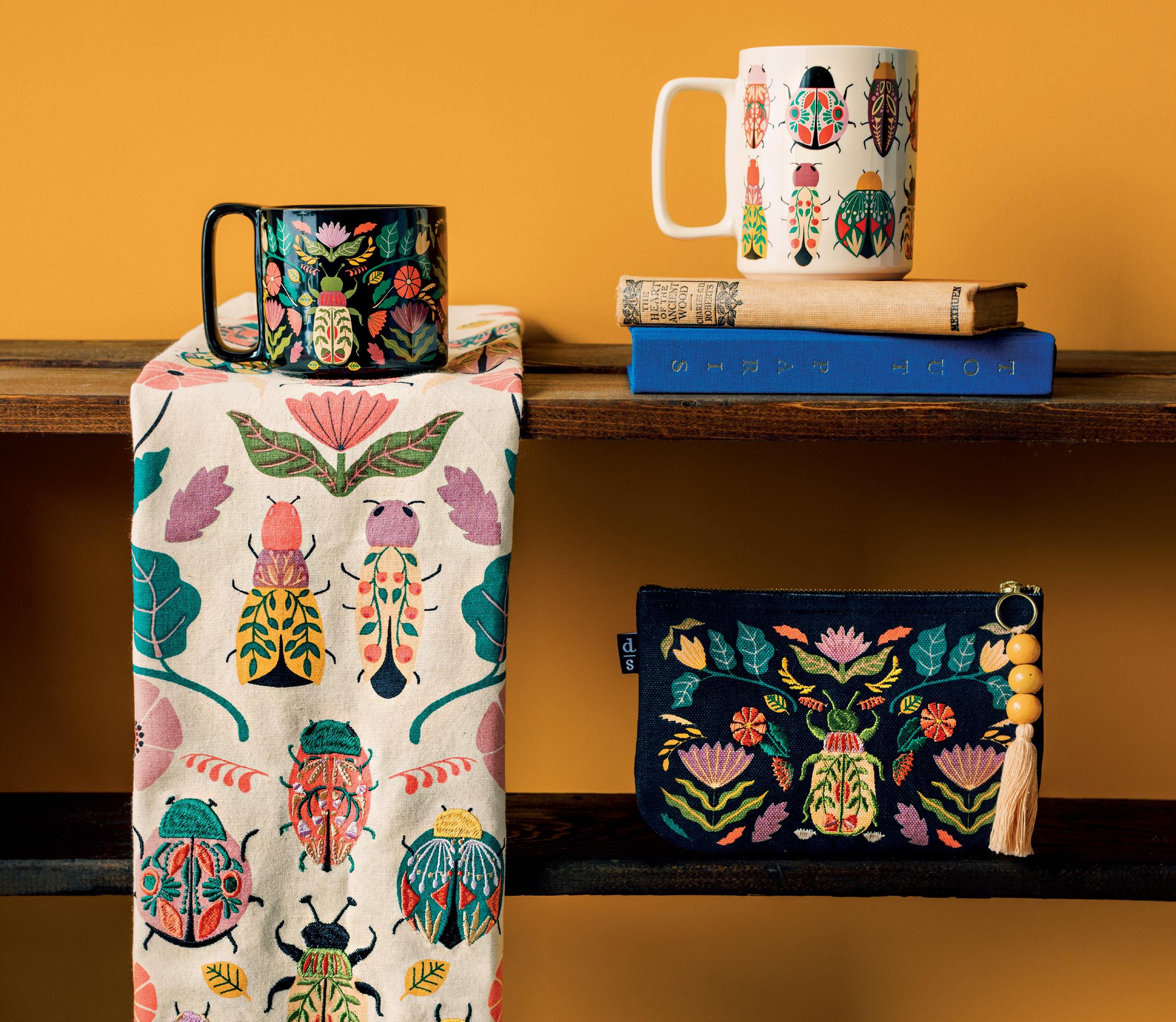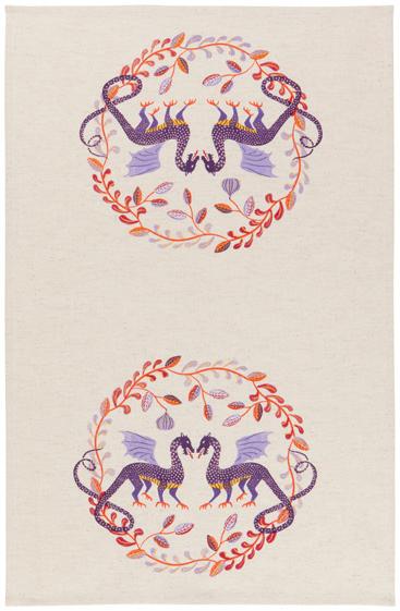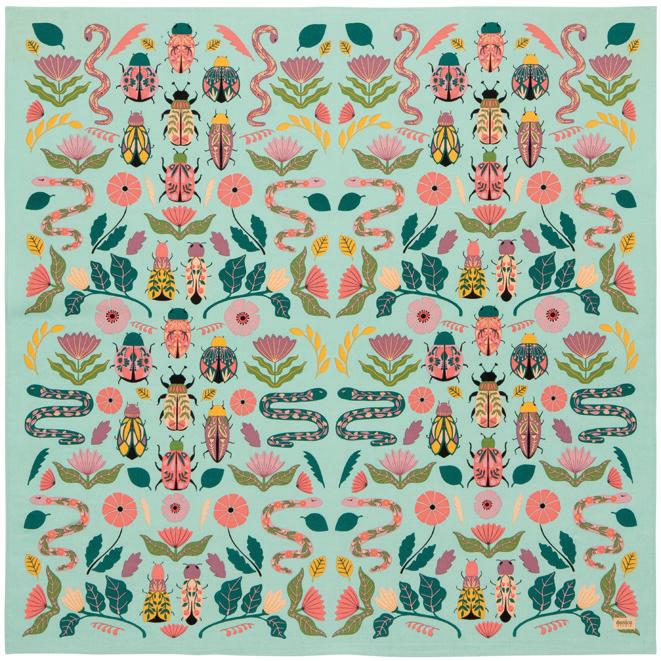 Fantastical florals burgeon with folk art flair. Exuberant lines and textures are arranged in unexpected symmetry while rich ochre and burgundy frolic with soft pink and green, mimicking the duality of nature’s fierce beauty.