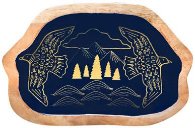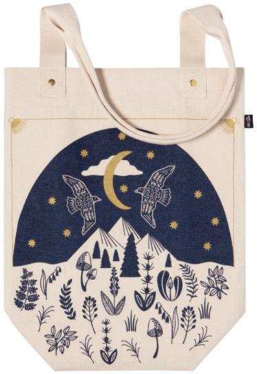 Gaze up through a canopy of firs to see the night sky illuminated by the moon and twinkling stars. Gold metallic detailing shines from a backdrop of inky blue, evoking the enchantment of a nocturnal landscape.