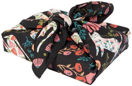 Decorative, square-shaped fabrics can be folded and tied to create a stunning and sustainable gift presentation. 85% RECYCLED COTTON / 15% RECYCLED POLYESTER · 32 × 32”
