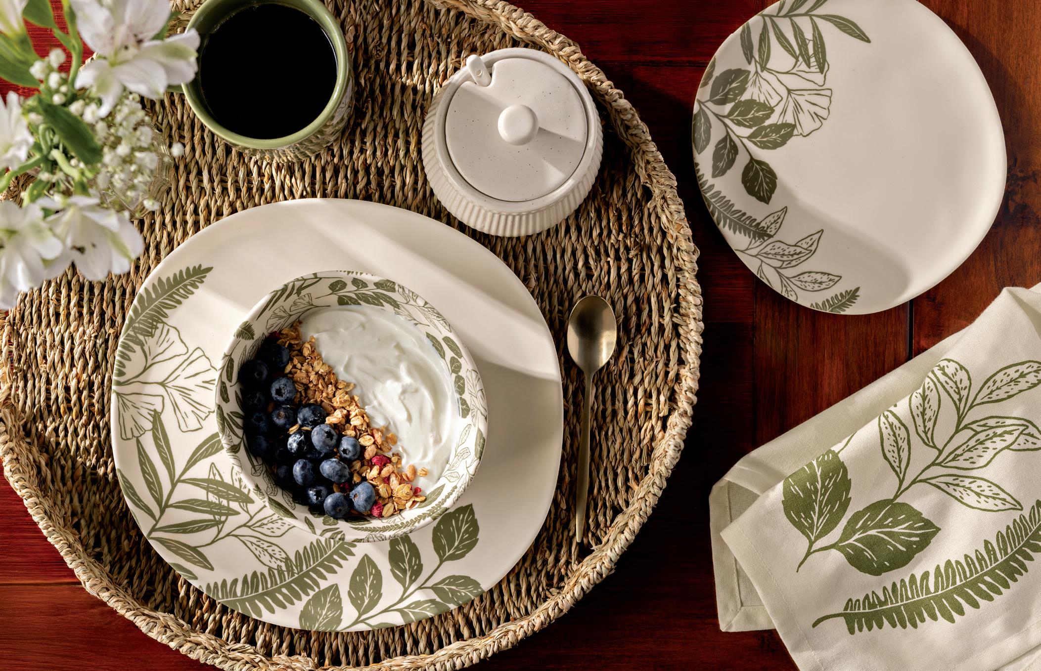 A lush ode to nature, Fern & Frond features layered leafy botanicals in earthy green and soft cream. Enduringly fresh, this collection pairs organic elegance with modern color blocking for year-round beauty.