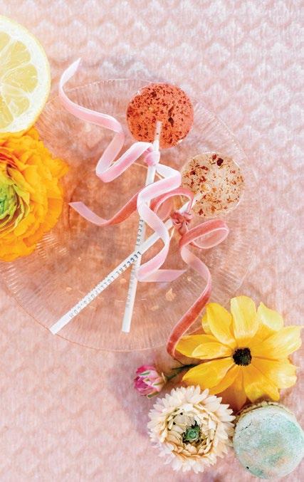 (Above) The invitation suite designed by Megan Kattengell of Camellia Memories features a floral motif digitally printed on blush handmade, deckle edge paper. The envelopes, made of handmade paper in the color Dusk with a cream cardstock envelope liner, are hand-addressed in Dr. Ph. Martin’s black india ink in an elegant narrow italic script by New Orleans calligrapher Hannah Jordan of Handwritten Hannah. The invitations are tied with velvet ribbon and embellished with a gourmet White Peach and Rose Lollipop by Leccare Lollipops based in Winder, Georgia.