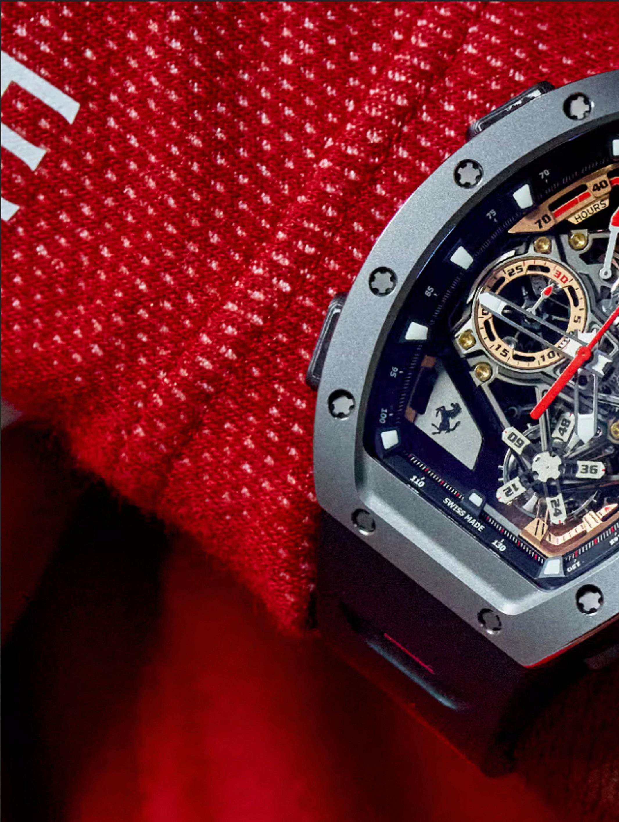 Chronograph Ferrari marks the latest achievement in the ongoing collaboration between Richard Mille and Ferrari. Following their groundbreaking RM UP-01 Ultraflat Ferrari in 2022, this new creation reinvents the complex tourbillon split-second chronograph format.
