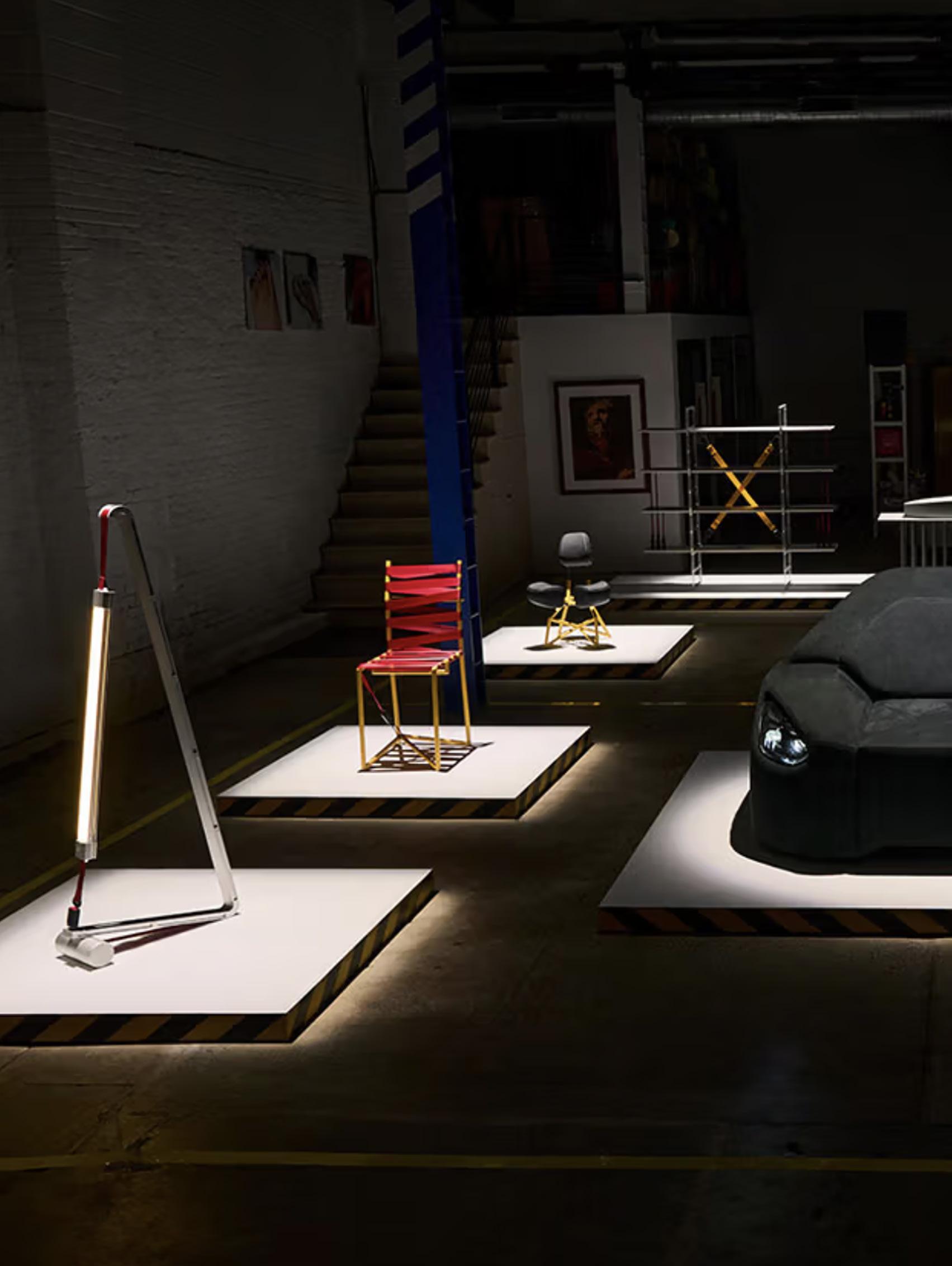 The pieces in the concept collection “Not for Automotive Use” pay homage to Italy’s Radical Design counterculture movement of the 1960s. In the tradition of this movement, MSCHF experiments with form and materials to reimagine a high-performance machine—a Mercedes-AMG performance model—transformed into an everyday object like a standing light, or an ergonomic chair. The design process of the artist collective tips its hat to Achille Castiglioni (1918-2002), the Milanese designer who took proletarian repurposing to new heights by integrating tractor and bicycle seating into his seat designs.