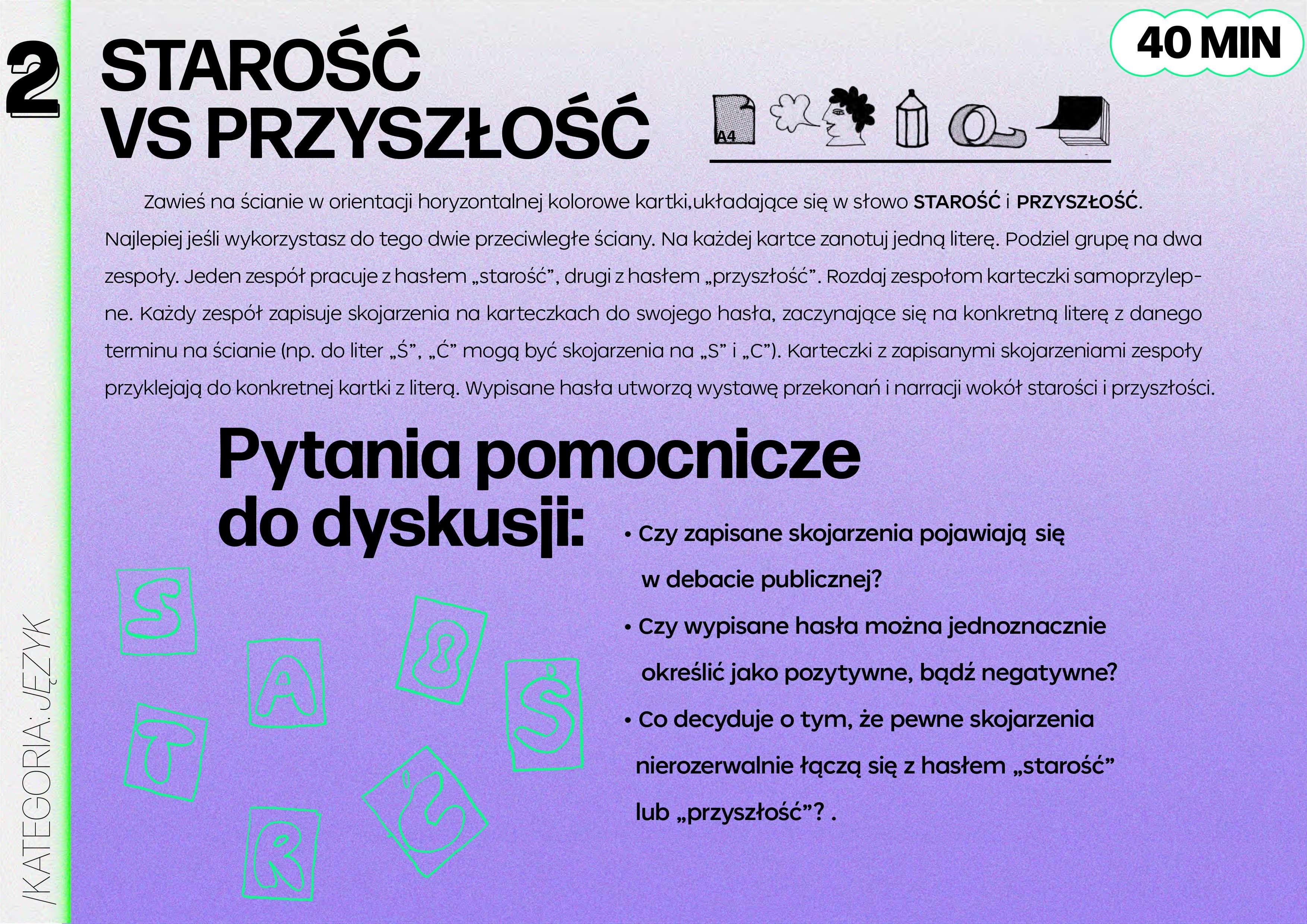Przy każdym proponowanym ćwiczeniu znajdziesz informację o sugerowanym czasie realizacji zadania. Pamiętaj, że na długość działań może wpływać liczba uczestników_czek oraz dynamika pracy grupy. Warto podzielić się informacją o planowanym czasie trwa nia zadania z grupą, aby wszystkie osoby wiedziały, jak rozłożyć poszczególne części danego ćwiczenia.