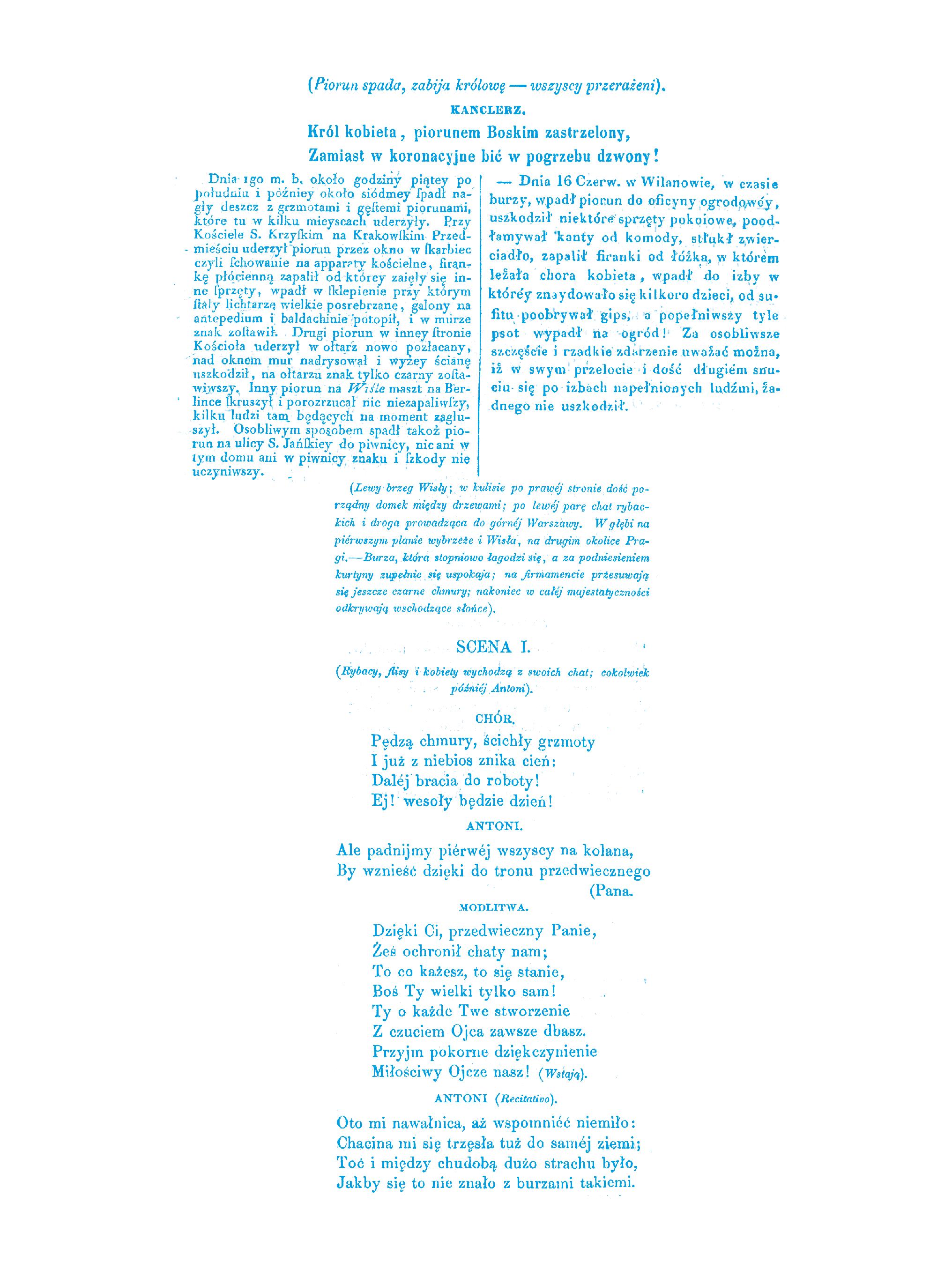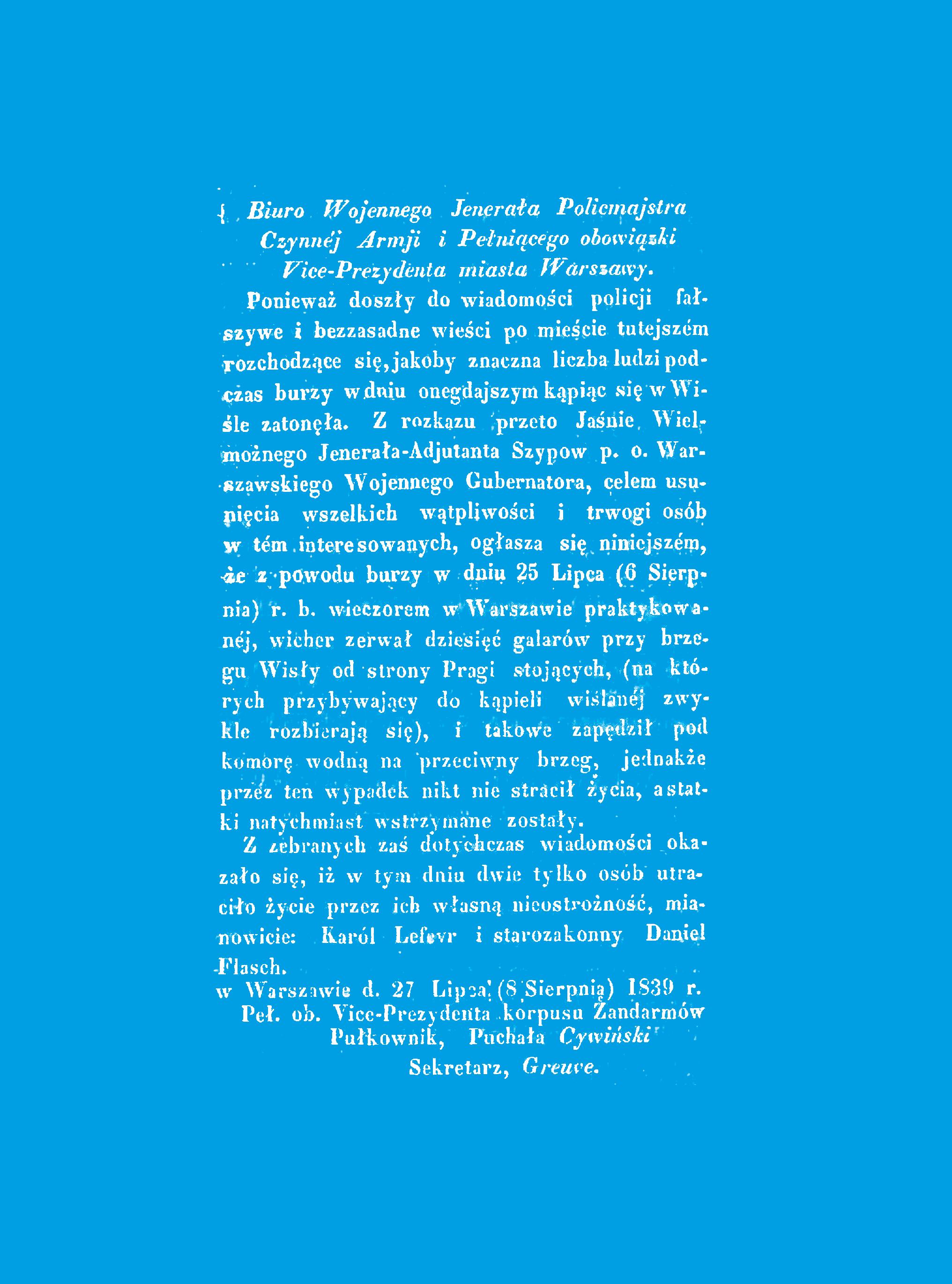 S. Bogusławski, „Flis: obrazek ludowy w jednym akcie”, Warszawa 1858, s. 5–6. 1839 [Kom. wiceprezydenta miasta 8 VIII o skutkach wichury 7 VIII] „Gazeta Codzienna” nr 2564, s. 1.