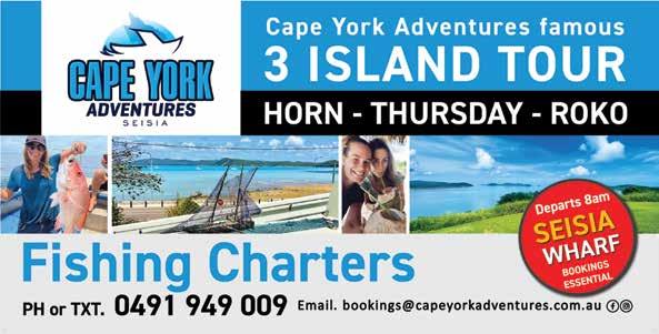 www.capeyorkiceandtackle.com 07 4069 3695 WE ARE LOCATED BETWEEN BAMAGA AND SEISIA JUST OUT OF NEW MAPOON Bully’s Fishing Camp & Boat HireCape York Hire Boats www.capeyorkhireboats.com • 07 4069 3695 HIRE 18FT BOATS Local family owned and operated since 2002 Retail outlet of locally grown pearls More then just a Tackle Shop... RETAIL ACCOMMODATION CHARTERS CAMPING EQUIPMENT TRAILER/MARINE PARTS LET’S GO FISHING
