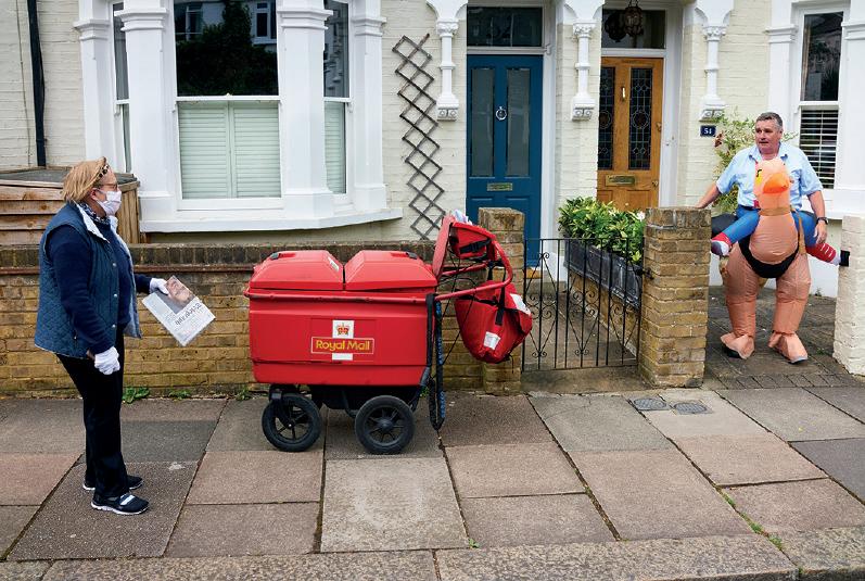 Many of the images in the project show a terrific sense of humour despite the challenges of lockdown. This Putney postman lifted the spirits of local residents by wearing fancy-dress costumes on his rounds. He apparently had five various outfits and wore a different one each day unless it was raining! This was just one of multiple images of key workers supporting communities with essential services.