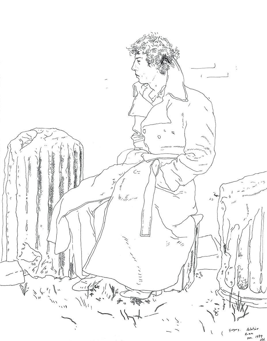 Gregory Evans has remained a consistent model and close companion for many years. The portraits, in which he can be seen in many moods and guises, reflect the intimacy of their friendship. Gregory. Palatine, Roma. Dec. 1974 was made in the early years of Hockney’s relationship with Gregory when they travelled extensively together and forms part of the artist’s visual diary. In this drawing Hockney uses a spare, unbroken line in pen and ink to capture his fascination with his new lover.