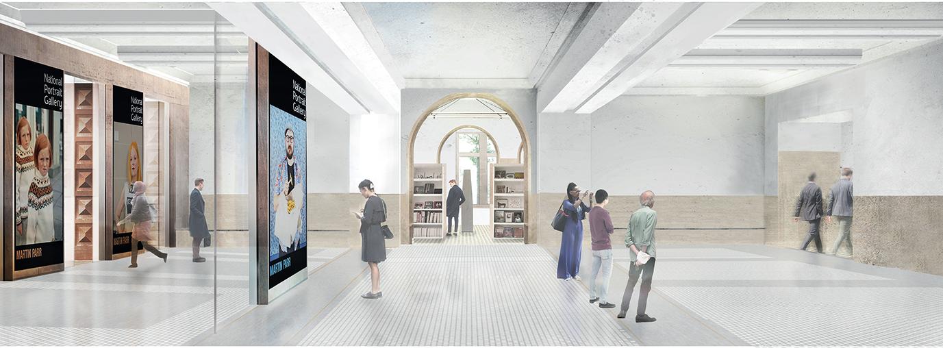A visualisation of the welcoming and spacious new entrance hall, with a glimpse of the new shop beyond by Jamie Fobert Architects