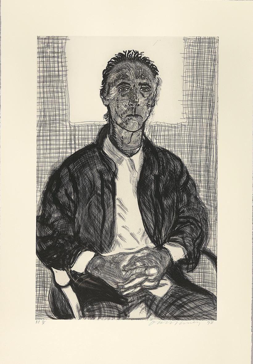 etching projects, as well as being the subject of many portraits. In 1998 Hockney returned to making etchings, a printing process he hadn’t explored since The Blue Guitar series of the mid-Seventies. To create the right conditions for the new works, Maurice prepared plates for the artist to work on directly and from life. Maurice, 1998 demonstrates the inventiveness of Hockney’s approach.