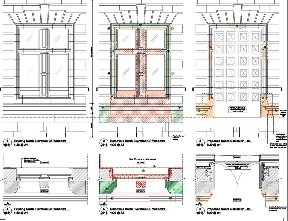 A technical drawing which reveals how three original windows on the north façade will be transformed into the Gallery’s new entrance doors by Purcell