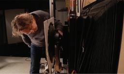 Learoyd has constructed a room-sized camera in his east London studio, measuring roughly 3m2. To create a portrait, he carefully positions his sitter in an adjacent room, connected to the camera obscura by a lens that projects the subject’s image into the dark chamber. Learoyd enters the camera obscura to make refinements to the position and focus of the image, then closes down the lens, attaches a large sheet of light-sensitive photographic paper to the back wall, and steps out of