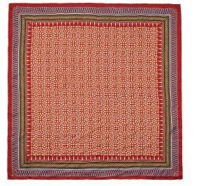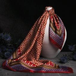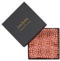 This new scarf design features decorative elements found in our Elizabethan portraits, including tear-drop pearls, patterns reminiscent of ruffs and gilded frames, all surrounding a central field filled with an intricate, decorative lace pattern on a vivid red background.