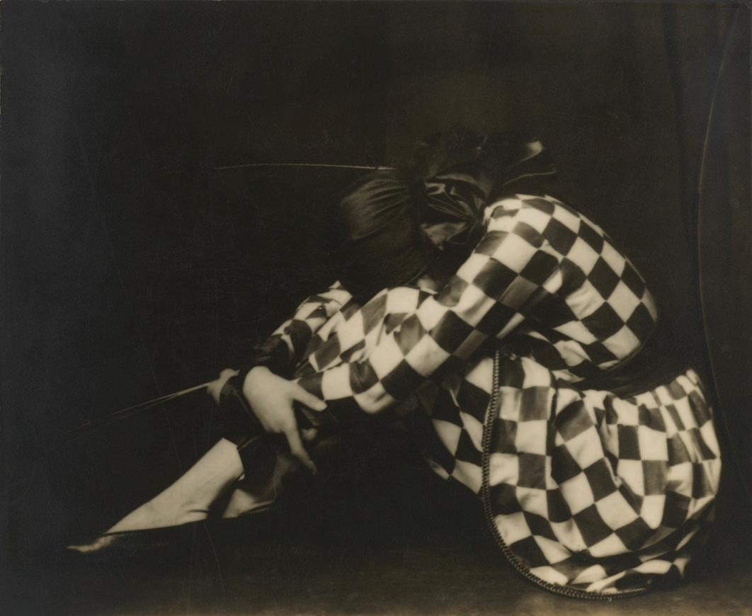 Yevonde’s accomplished, art-inspired works appeared in influential photographic journals and the London Salon of Photography included her celebrated narrative scene Invitation. The Harlequin as a figure in art appealed to Yevonde, who adopted his ambiguous traits in her self-portrait from this time.