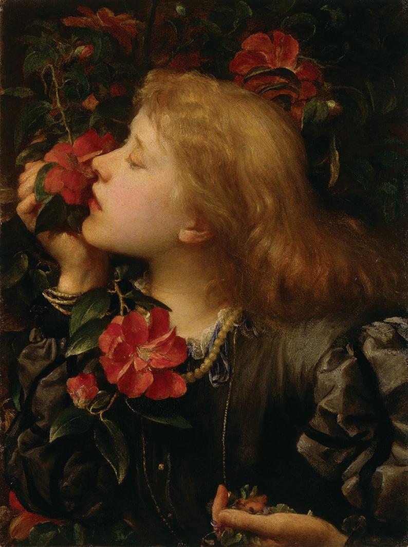 The portrait is the epitome of romance. It shows Ellen Terry in a bower of flowers, where she must choose between the earthly vanities, as symbolised by the showy but scentless red camellias, and the virtues of modesty and fidelity, as symbolised by the humbler but fragrant violets. The circumstances of the portrait were in