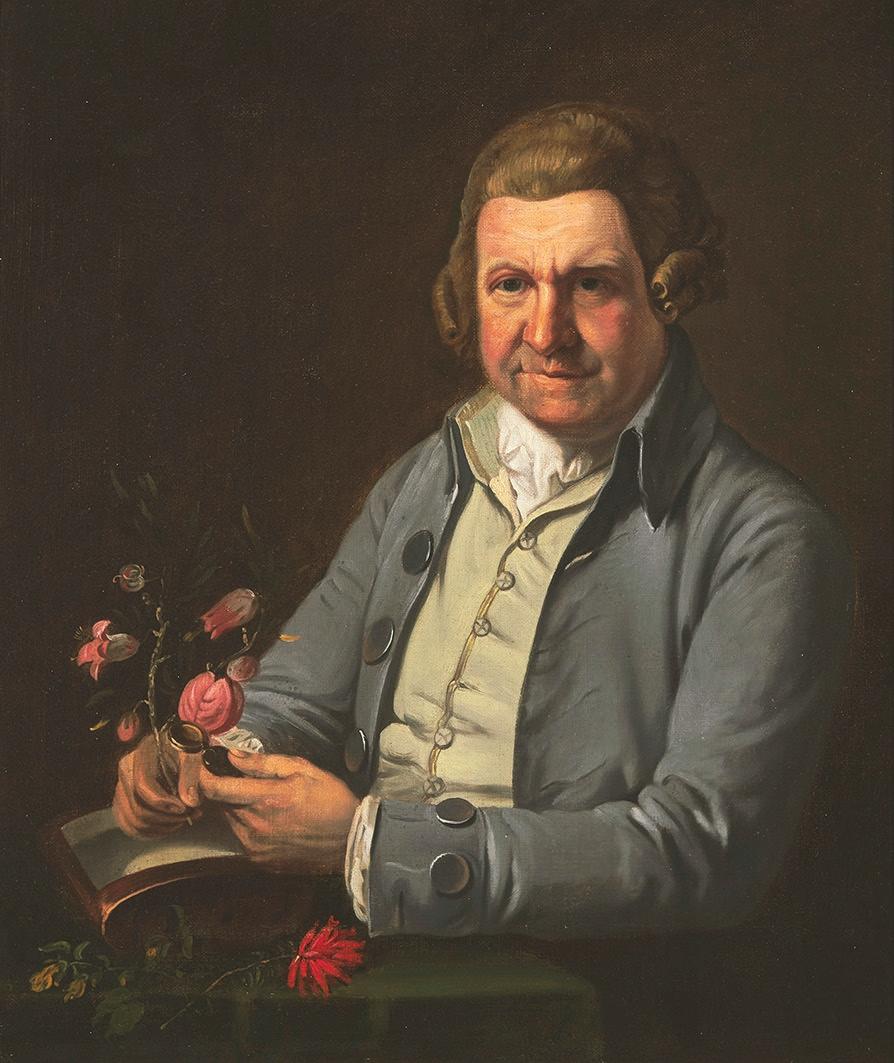 bedizened with cut-steel buttons, with a glimpse of a luxurious waistcoat of gold stuff; William Aiton – Botanic Gardener to King George III – portrayed with a vasculum and grasping an Aitonia capensis; and the 18-year-old Byronic Hofgärtner Otto Ludwig Sckell, a magnificently whiskered ‘hipster’ wearing a loose-fitting white chemise.