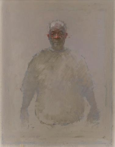 a painstaking and exacting medium. Williams knows the competition well, having first entered the award in 1995; he has since exhibited ten times, winning third prize in 2017. All his work is based on direct and intense observation from life, often giving equal prominence to the objects in the background and the portrait subject. In contrast, the artist Nathan Ford uses a limited palette and sparsely painted marks that often obscure more than they reveal. Ford painted Monument 3, based on sittings from over a decade earlier, over several years as a way to come to terms with his father’s death.