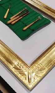 Right (from left) – Claire Irvine carving the new frame; burnishing the frame