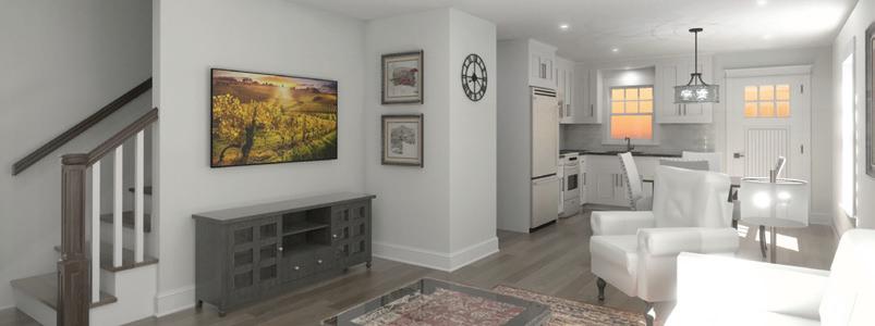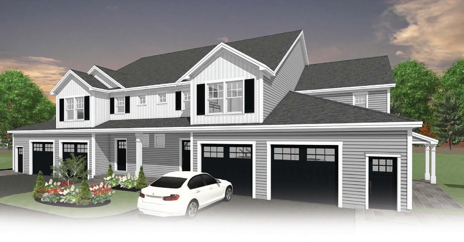 and dining area that will be drenched in sun, plus separate laundry/mudroom. with double vanity sink, tiled shower, and a massive walk-in closet. Unit #1 conveys with a 2-bay detached garage with extra storage space include: pervious driveway, 4 over 4 vinyl siding, composite trim, ZipSystem sheathing, ear architectural shingles, Heating and AC via ducted heat pump system w elec coil b/u (no fossil fuels), 6-8” Unit features include: plank wood oors and Mathews Bros d