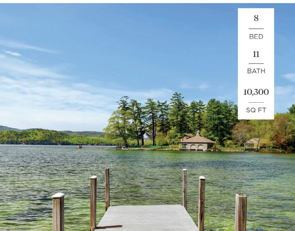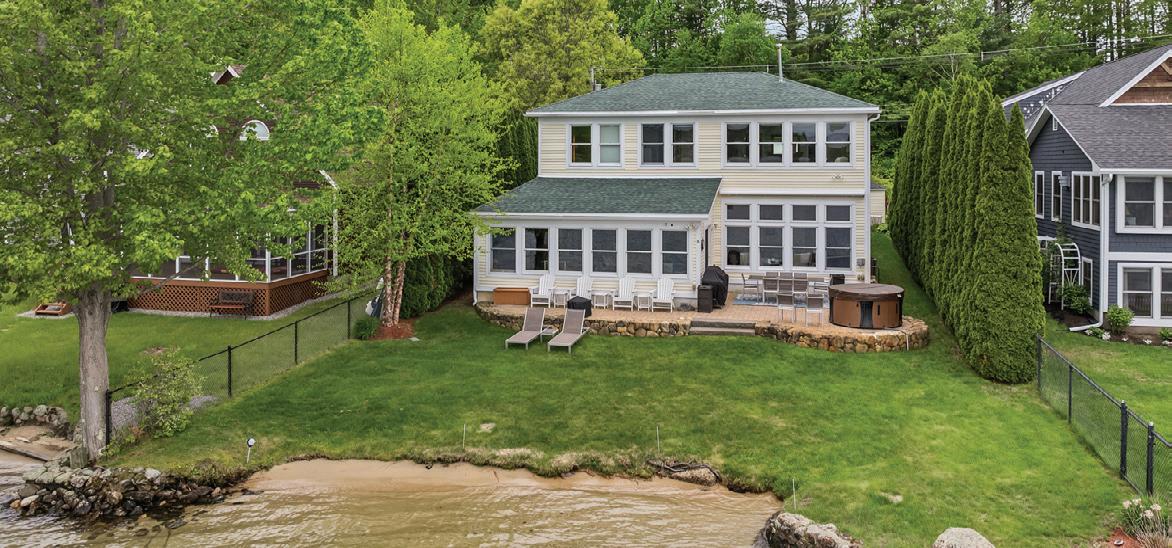 90 PAUGUS PARK RD, LACONIA - $2,495,000 The perfect blend of comfort, elegance & beauty. With a sandy beach and a level lot, it provides effortless access to the water. Includes a waterside patio and spacious dock, with hot tub. The large Great Room with fireplace and high ceilings is open to the well appointed kitchen. Main-level bedroom and 4 additional second-level bedrooms, there’s ample space for guests. Custom storage shed, generator, central air and propane heat.
