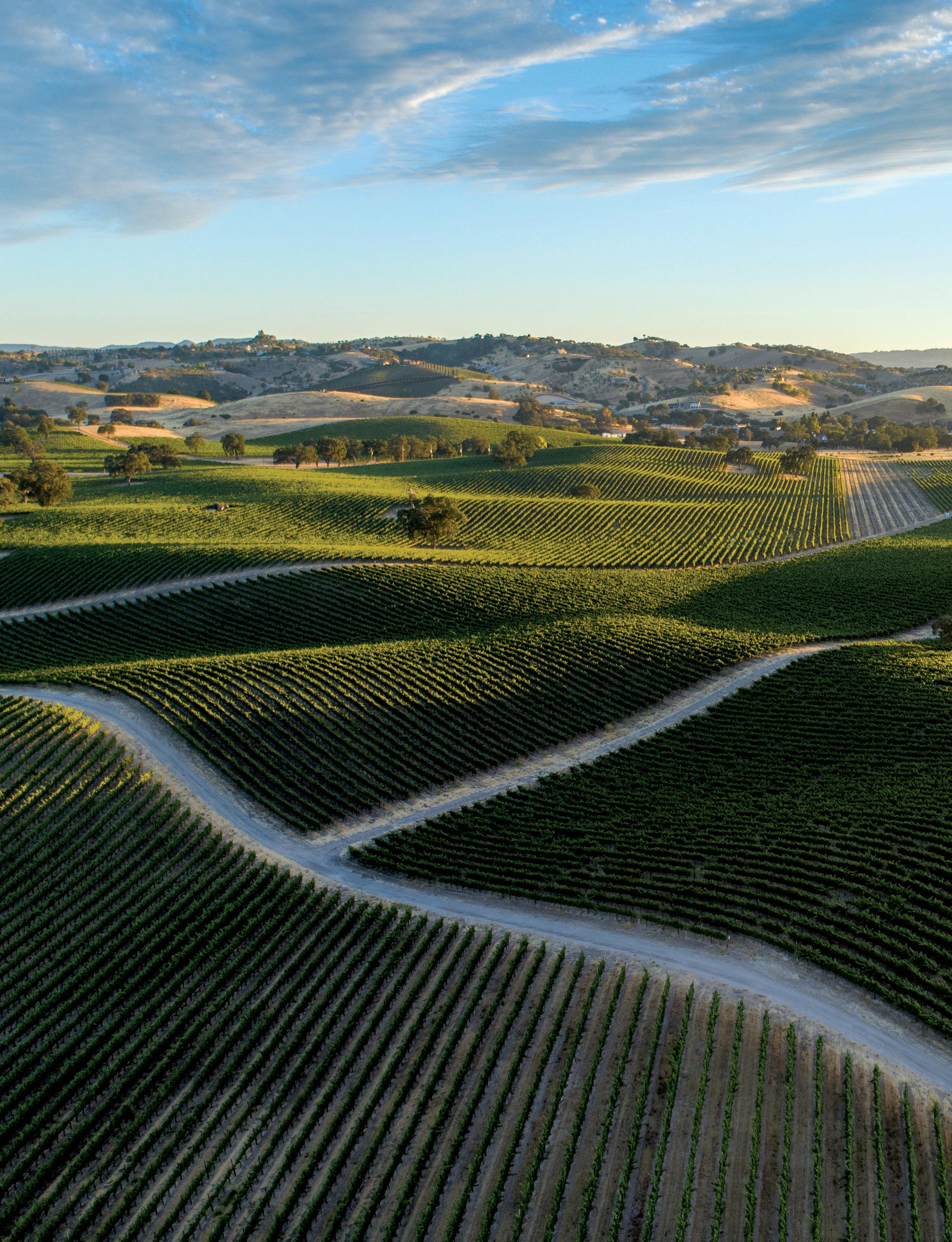 • Rolling vineyards and oak-dotted hillsides