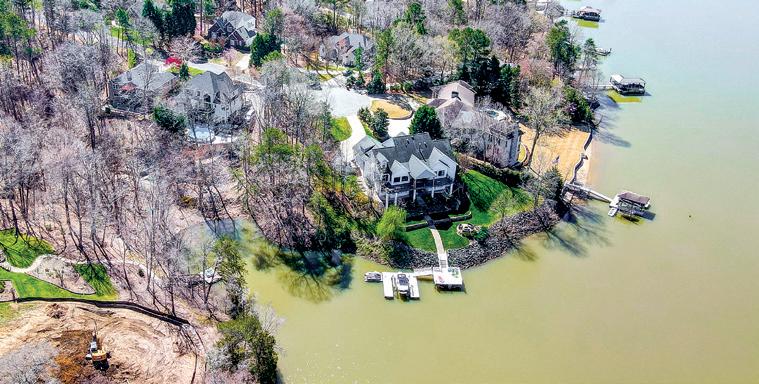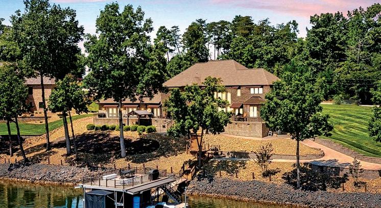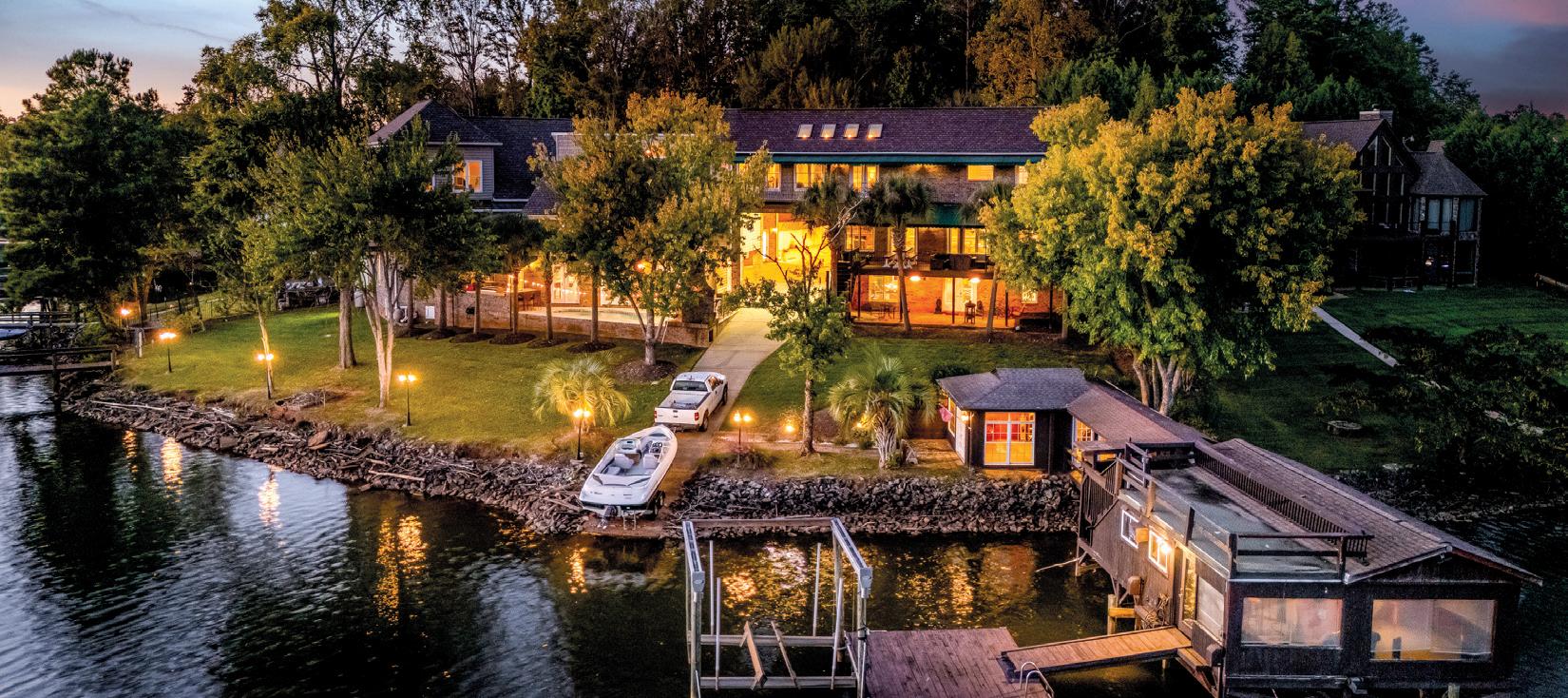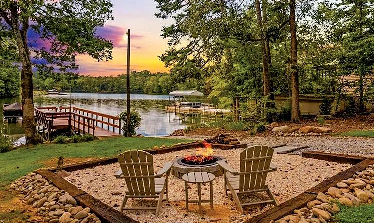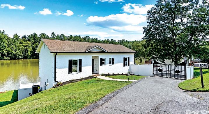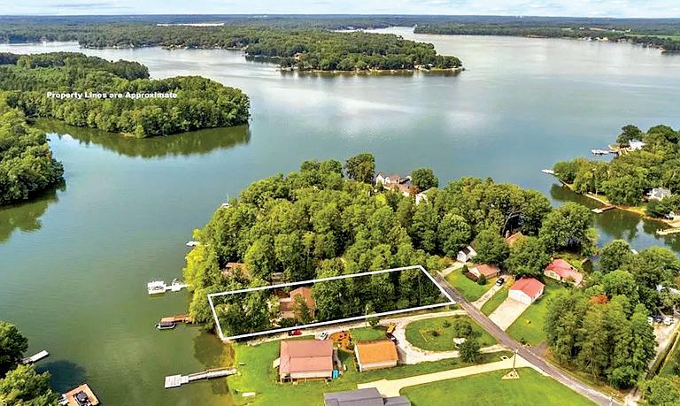3 BR/2 BA. Dock tag visible. Gently sloping lawn, private ramp, pier w/ covered dock + 2 jet-ski docks. Approved 3-bed septic. Picnic shelter, fire pit, 16x14 storage, under-home storage. Appliances, TVs, porch rockers, swing & tables stay. Covered parking. Movein and lake living ready.