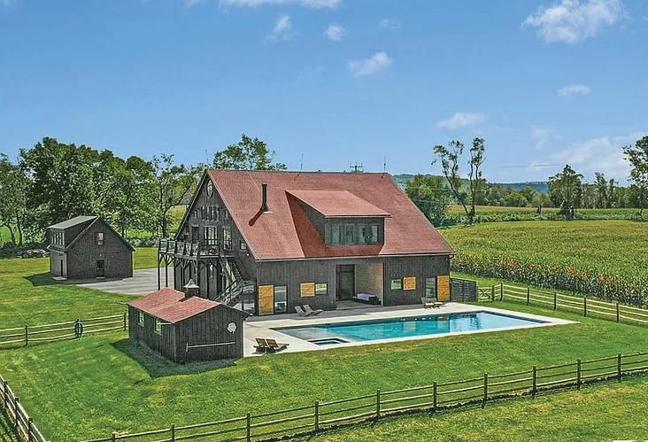 A rare and beautiful example of a barn renovation with re-imagined vaulted spaces and panoramic views, with a pool and outbuildings perfectly positioned among the acreage.