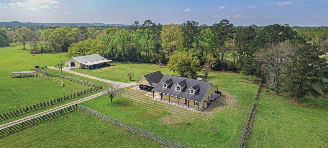 Equine, cattle, or recreational property with modern improvements located approximately 6 miles from Huntsville. With paved FM 980 frontage and gated all-weather access, this property is move-in ready. The ranch features open pasture, three ponds, seasonal Baldwin Creek frontage, and abundant native wildlife. The 2,323 SF custom farmhouse-style home offers 3 bedrooms, 2.5 baths, and a flex room, with inviting touches such as a stone fireplace and copper farmhouse sink.