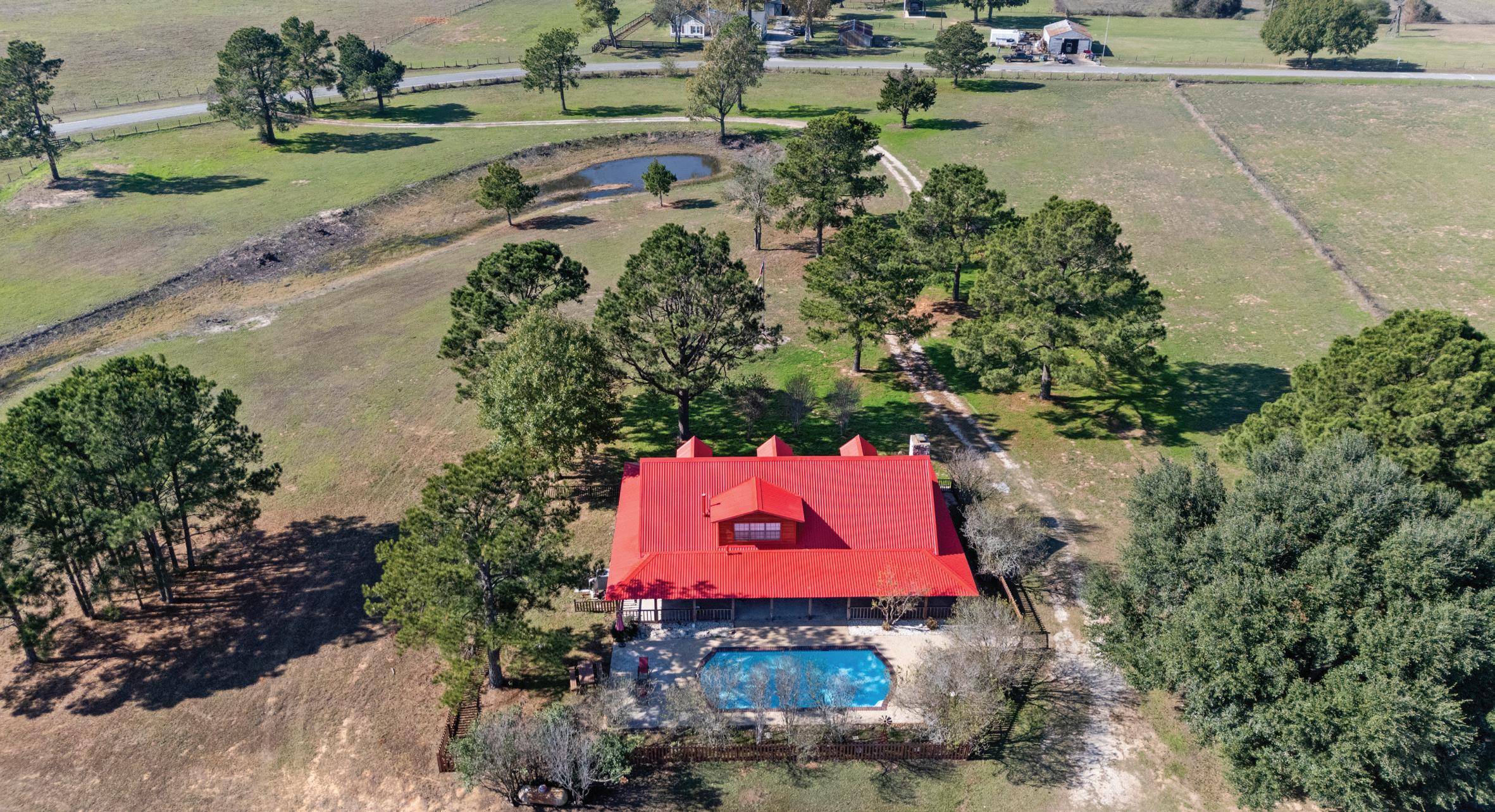 Rain Creek Ranch-Experience the beauty & privacy of this stunning 82-acre property with an electronic gated entrance, open pastures, wooded pockets and an abundance of wildlife. The 2,446 SF log cabin home offers 3 bedrooms, 3 baths, with 2 bedrooms on the main level. The living room features a wood-burning fireplace and opens to the kitchen, creating a warm space. Enjoy outdoor living with a beautiful pool and deck. The property holds a wildlife exemption and includes 3 ponds and has bird, owl and butterfly nesting houses throughout the property along with deer feeders. A large metal storage building, and 2 smaller barns are perfect for equipment and storage. Experience the unmatched serenity and beauty of Rain Creek Ranchwhere country living meets comfort and convenience. Waller county is experiencing tremendous growth and developers are welcome!