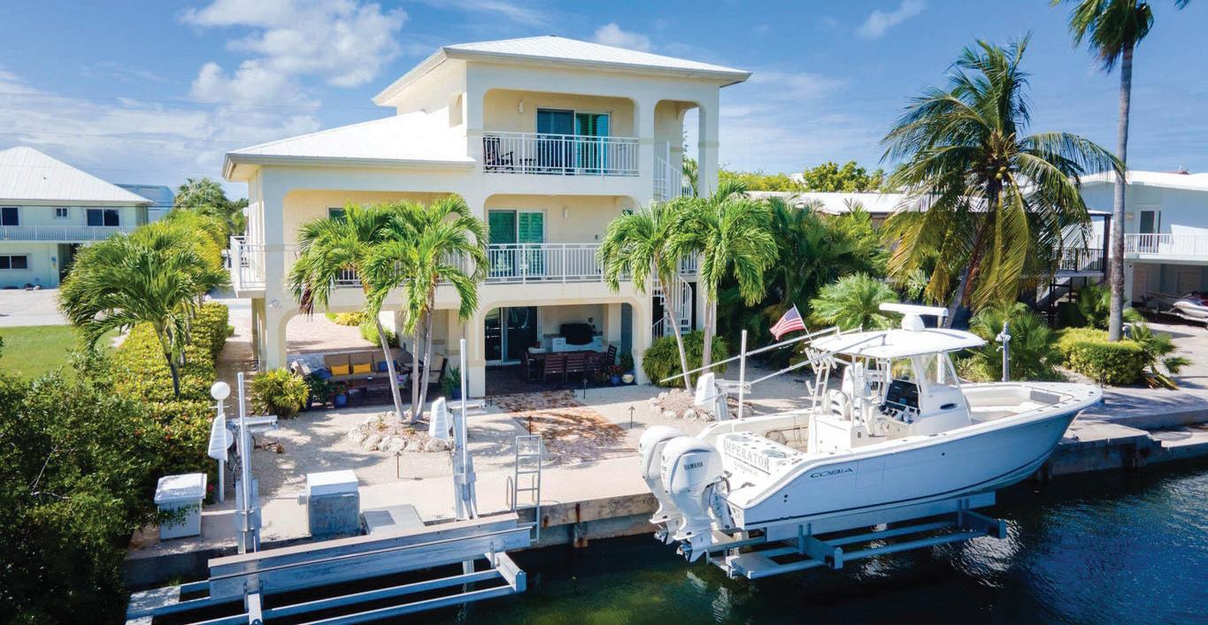Embrace refined island living in this waterfront home, where tropical serenity meets effortless sophistication. Perfectly positioned on a lush corner 9,255 sq. ft. lot framed by stately date palms and vibrant landscaping, this coastal sanctuary captures the essence of the Florida Keys lifestyle—relaxed, elegant, and immersed in natural beauty. 111+ feet of concrete dockage, “L-shaped”. Enclosed two-car garage below.