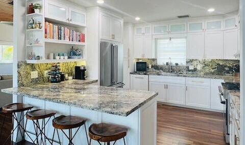 MODERN MIDTOWN RETREAT offers the perfect balance of privacy and proximity—just minutes from Key West’s finest dining, beaches, and nightlife. The open-concept floor plan welcomes you with high ceilings, light-filled living spaces, designer finishes, and seamless indoor-outdoor flow through retractable impact glass doors. The updated kitchen features quartz countertops, tile backsplash, premium stainless-steel appliances, and overlooks the dining and living room. Ideal for entertaining.